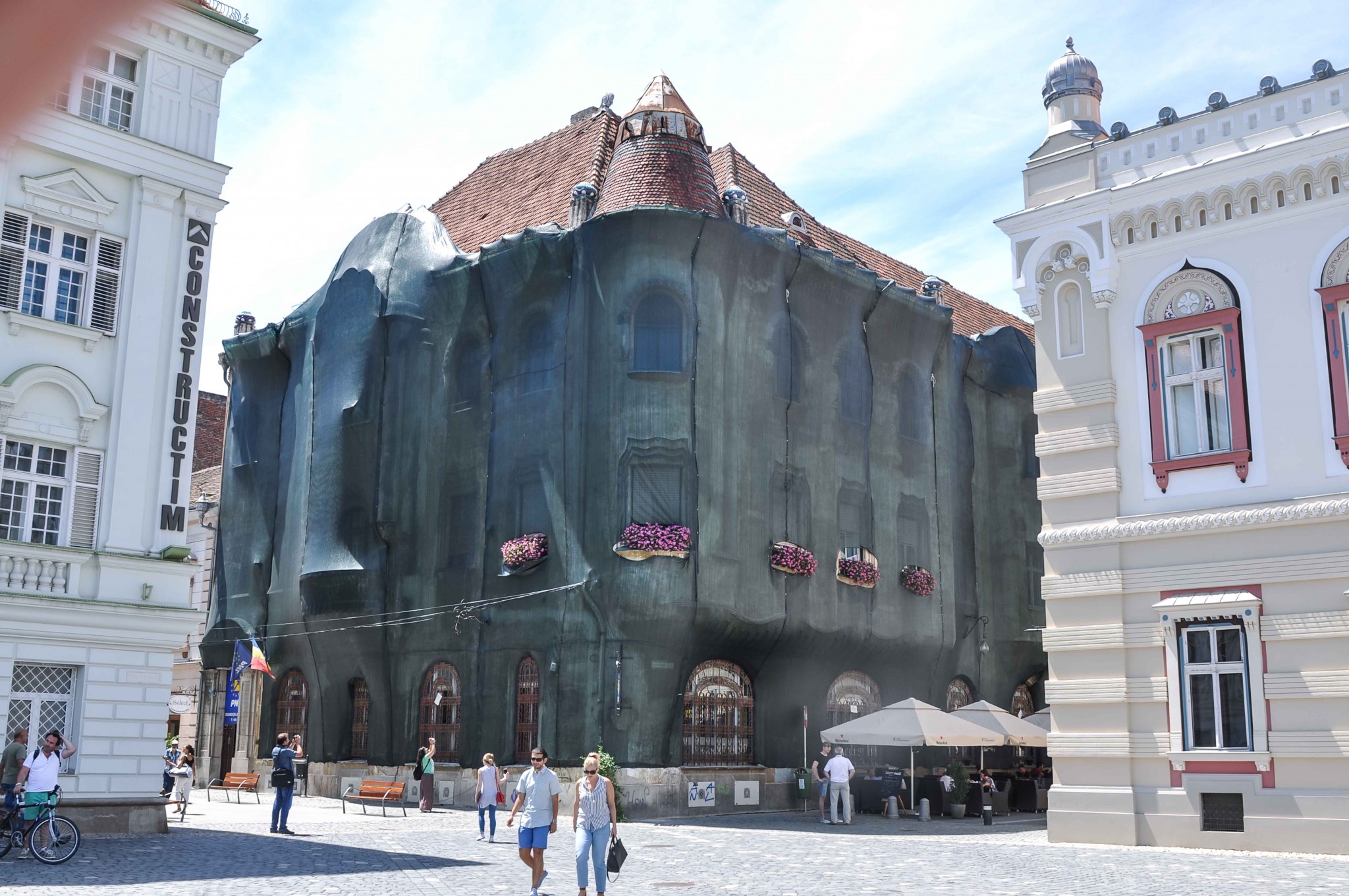Una dintre cele mai frumoase, dar şi degradate clădiri din Piaţa Unirii, casa cu faianţă cum este cunoscută de timişoreni, unde are sediul şi PNL, şi-a ascuns faţada. Pe imobil a apărut o plasă de protecţie. Din păcate nu este un pas spre reabilitare.