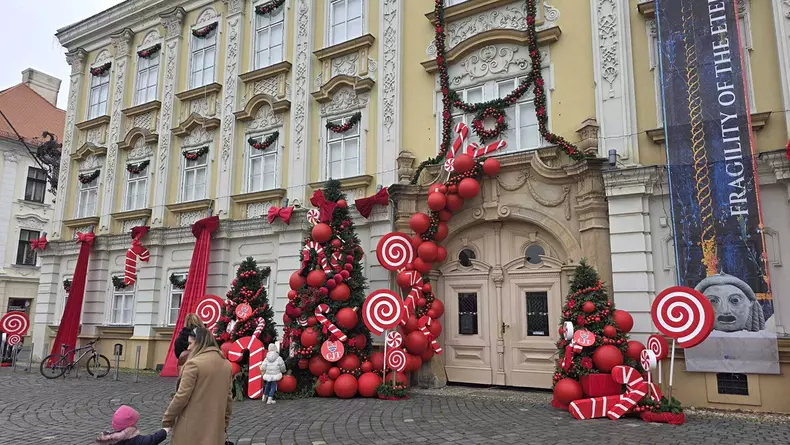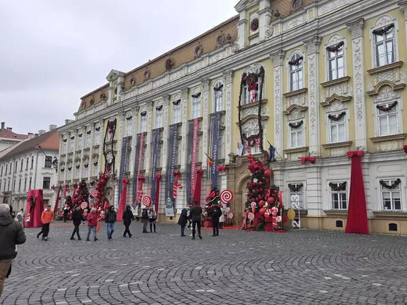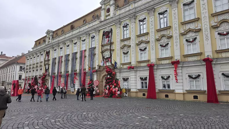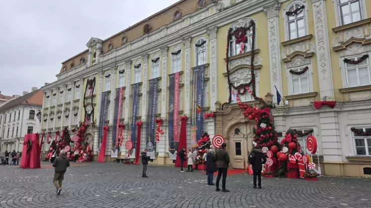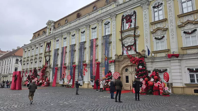 Consiliul Județean Timiș și Palatul Baroc din Piața Unirii, clădire a Consiliului Județean Timiș care găzduiește Muzeul de Artă din Timișoara, au fost împodobite cu ocazia Crăciunului din 2025 într-un mod care a atras puternic atenția trecătorilor.