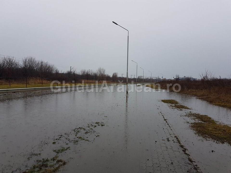 Cantitatea enormă de apă, provenită din precipitaţii, a cauzat deja blocaje în cele mai problematice zone ale Aradului, astfel că, în mai multe locuri din oraş, canalizarea pluvială cu greu mai face faţă, iar în unele zone, apa a inundat porţiuni mari de drum.