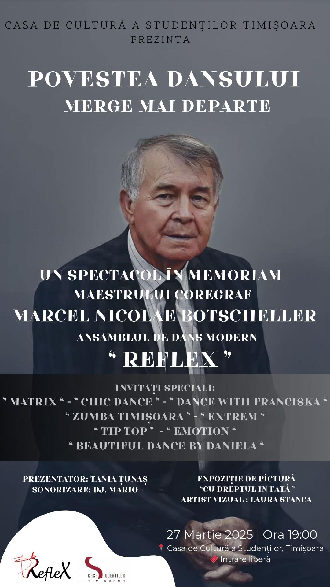 Pe 27 martie 2025, de la ora 19:00, Casa de Cultură a Studenților din Timișoara va găzdui un spectacol omagial dedicat memoriei maestrului Marcel Nicolae Botscheller, una dintre cele mai marcante figuri ale dansului din România. Acest eveniment, organizat de Casa de Cultură a Studenților, este realizat cu sprijinul doamnei Angela Botscheller, văduva maestrului, și reunește elevi, discipoli și artiști care îi duc mai departe moștenirea.
