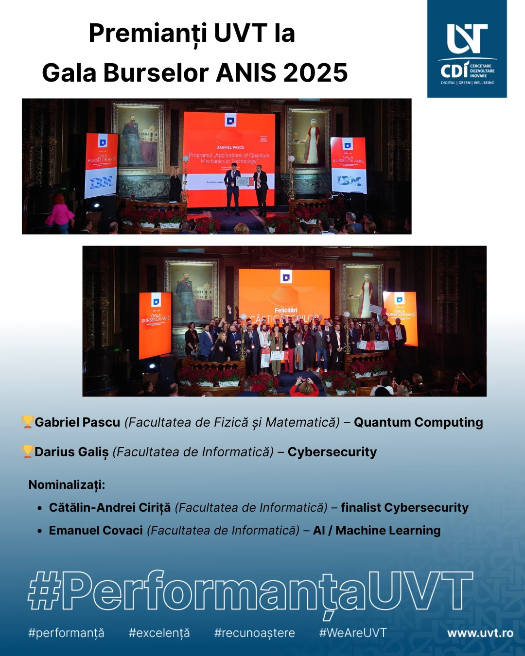 Merită cele mai calde felicitări Gabriel Pascu, de la Facultatea de Fizică și Matematică din UVT, și Darius Galiș, de la Facultatea de Informatică din UVT, distinși la Gala Burselor ANIS 2025. Gabriel Pascu a fost premiat la secțiunea „Quantum Computing”, iar Darius Galiș la secțiunea „Cybersecurity”, întrunind astfel recunoașteri care confirmă excelența și potențialul tinerilor cercetători UVT în domeniile tehnologice emergente.