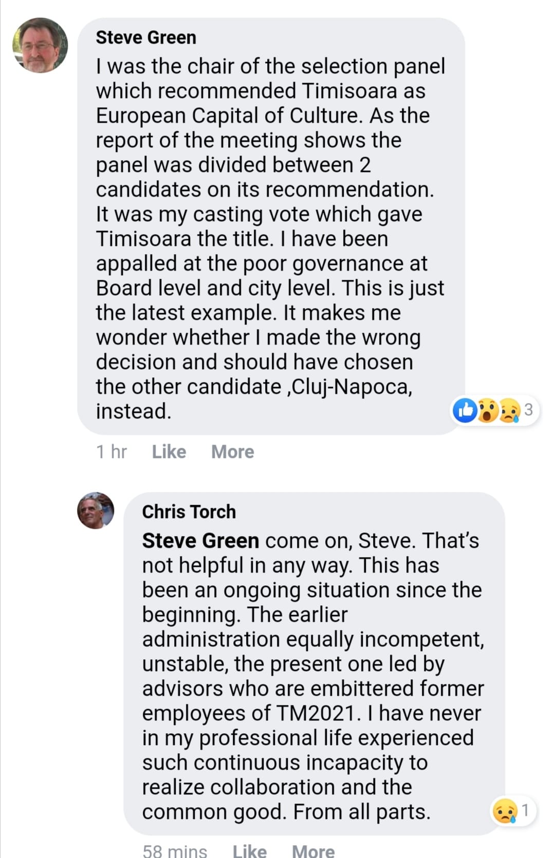 Steve Green a fost președintele comisiei de selecție care a recomandat ca titlul să ajungă la Timișoara. ”Așa cum arată raportul întâlnirii, comisia a fost divizată între doi candidați pe care să-i recomande. A fost votul meu cel care a stabilit ca titlul să ajungă la Timișoara. Am fost consternat de administrarea slabă la nivel de board și de oraș. Acesta e doar cel mai recent exemplu. Mă face să mă întreb dacă am luat decizia greșită și ar fi trebuit să aleg în schimb celălalt oraș, Cluj-Napoca”.