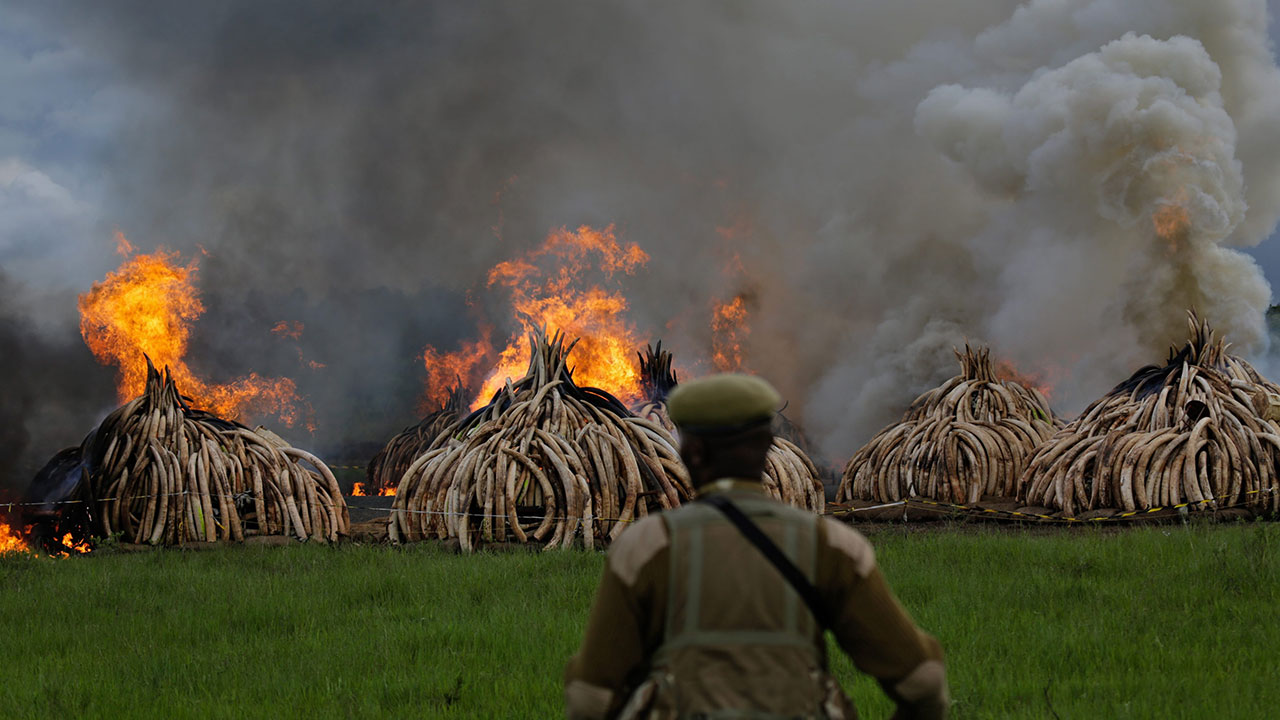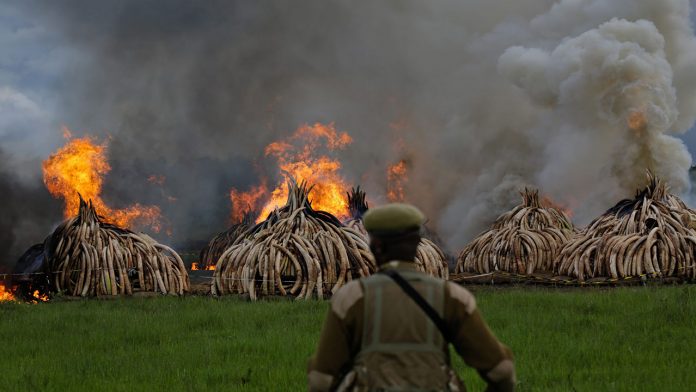 Președintele kenyan Uhuru Kenyatta a dat foc sâmbătă la 105 tone de fildeș și la peste o tonă de coarne de rinocer, în cadrul unei ceremonii menite să evidențieze situația dificilă a faunei sălbatice pe cale de dispariție.