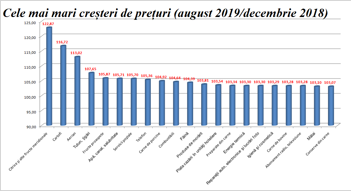 Citricele, cartofii, biletele de avion și țigările au fost produsele care s-au scumpit cel mai mult de la începutul anului, arată datele pubicate de Institutul Național de Statistică. Topul scumpirilor este continuat de fructe, cheltuielile legate de apă și salubritate, serviciile poștae și telefonie.