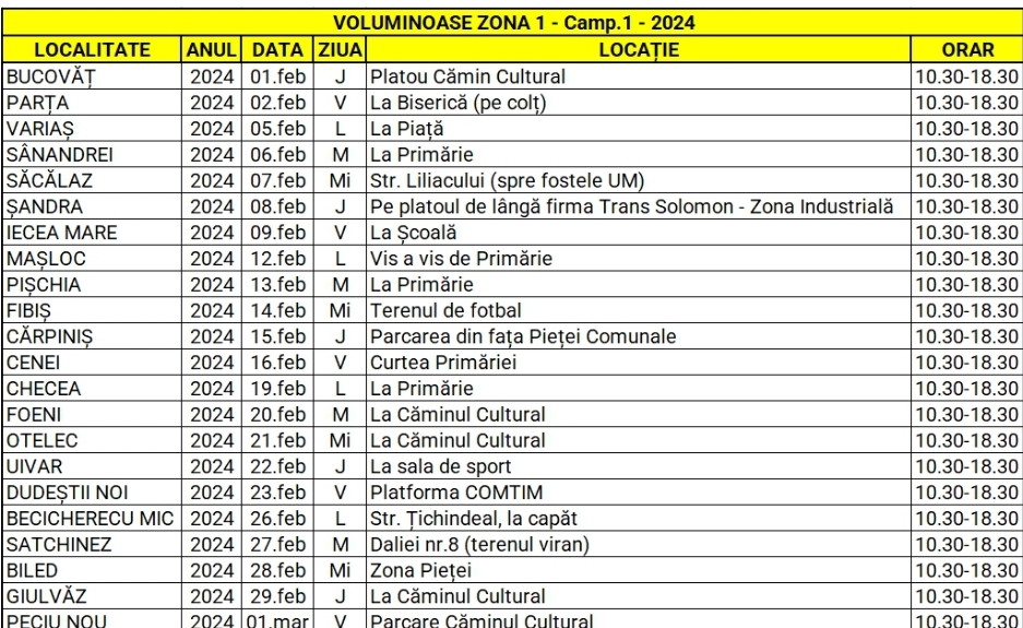 Cetățenii din localitățile menționate mai sus pot depune prin aport voluntar și gratuit deșeurile voluminoase în containerele special puse la dispoziție în punctele de colectare și între orele menționate în tabelul de mai jos.
