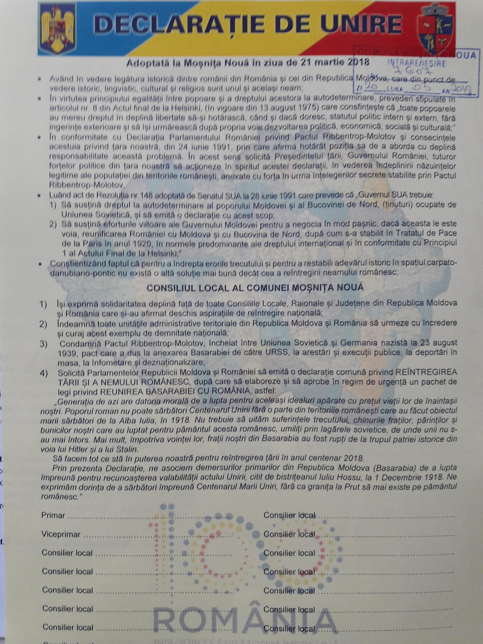 Consilierii locali ai Primăriei Moșnița Nouă, Remus Petruse, împreună cu Ioan Sorincău au depus, marți, 20 martie 2018, la secretariatul instituției, „Declarația de Reunire” cu Republica Moldova, actul simbolic urmând să fie înaintat pentru semnături Consiliului local Moșnița Nouă, în cadrul ședinței care se va desfășura joi, 21 martie.