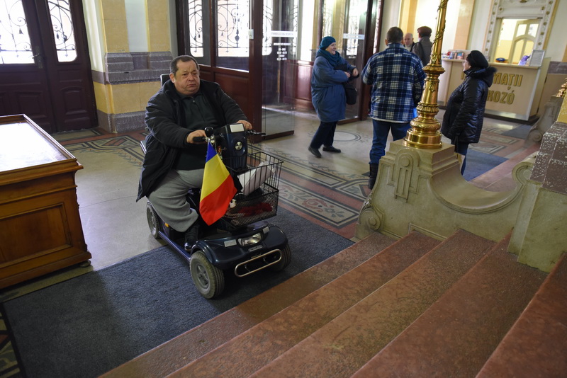 „Un pic de obligaţie are şi Primăria asta faţă de noi. Mai mult s-a investit în câini decât în persoanele cu handicap”, a spus cu năduf Dorin Langa, un orădean în vârstă de 66 de ani, imobilizat din într-un scuter electric din cauza handicapului său. Evident, nu avea cum să ajungă în Sala Ghişeelor. „Când am mai venit la Primărie, mi-au zis că n-au cum să mă ajute, că există un lift, dar nu funcţionează”, spune bărbatul.