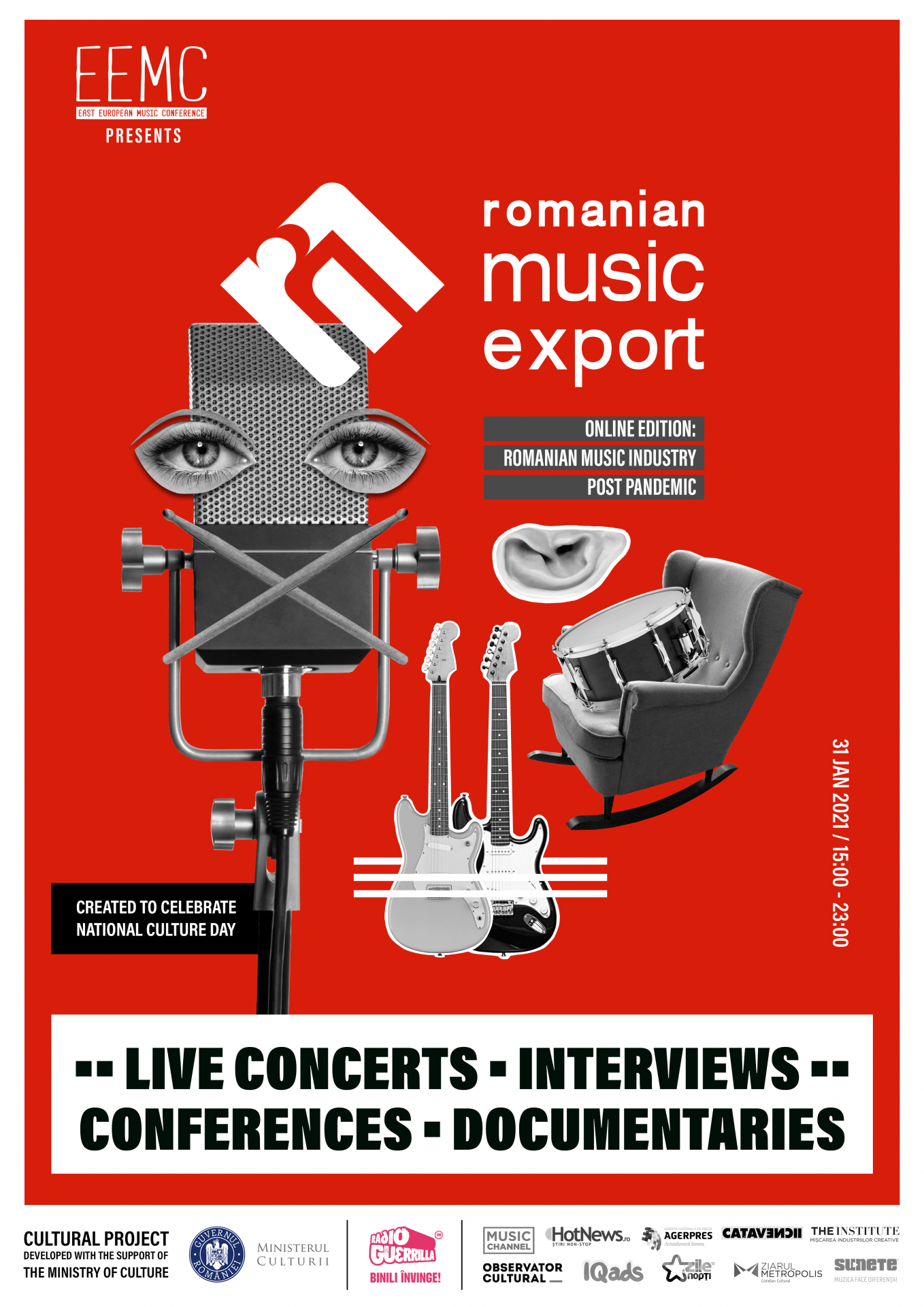 După un an sărac în evenimente, cu un sector cultural greu încercat și cu perspective neclare pentru 2021, profesioniștii din industria muzicală și a entertainmentului din România au mare nevoie de îndrumare, soluții și întâlniri pentru provocările curente și viitoare. În acest context, Romanian Music Export, primul program românesc din zona antreprenorială care își asumă misiunea de promovare și de export muzical la nivel european, va lansa pe 31 ianuarie 2021 Romanian Music Export Online. Evenimentul este gândit cu un format de emisiune TV, ce va consta din panel-uri de discuție live și înregistrate cu speakeri români și străini relevanți pentru industrie și showcase-uri de trupe românești.