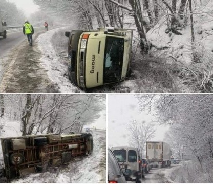 Cel mai la îndemână exemplu este cel dintre Sâmbăteni şi Ghioroc, unde, de altfel, a avut loc şi un accident. Tot „patinoar” este şi între Şiria şi Ghioroc, dar şi spre Felnac, susţin utilizatorii reţelei de socializare. Un alt accident a avut loc pe DN 7, la Milova, unde o maşină cu remorcă s-a răsturnat în afara părţii carosabile.