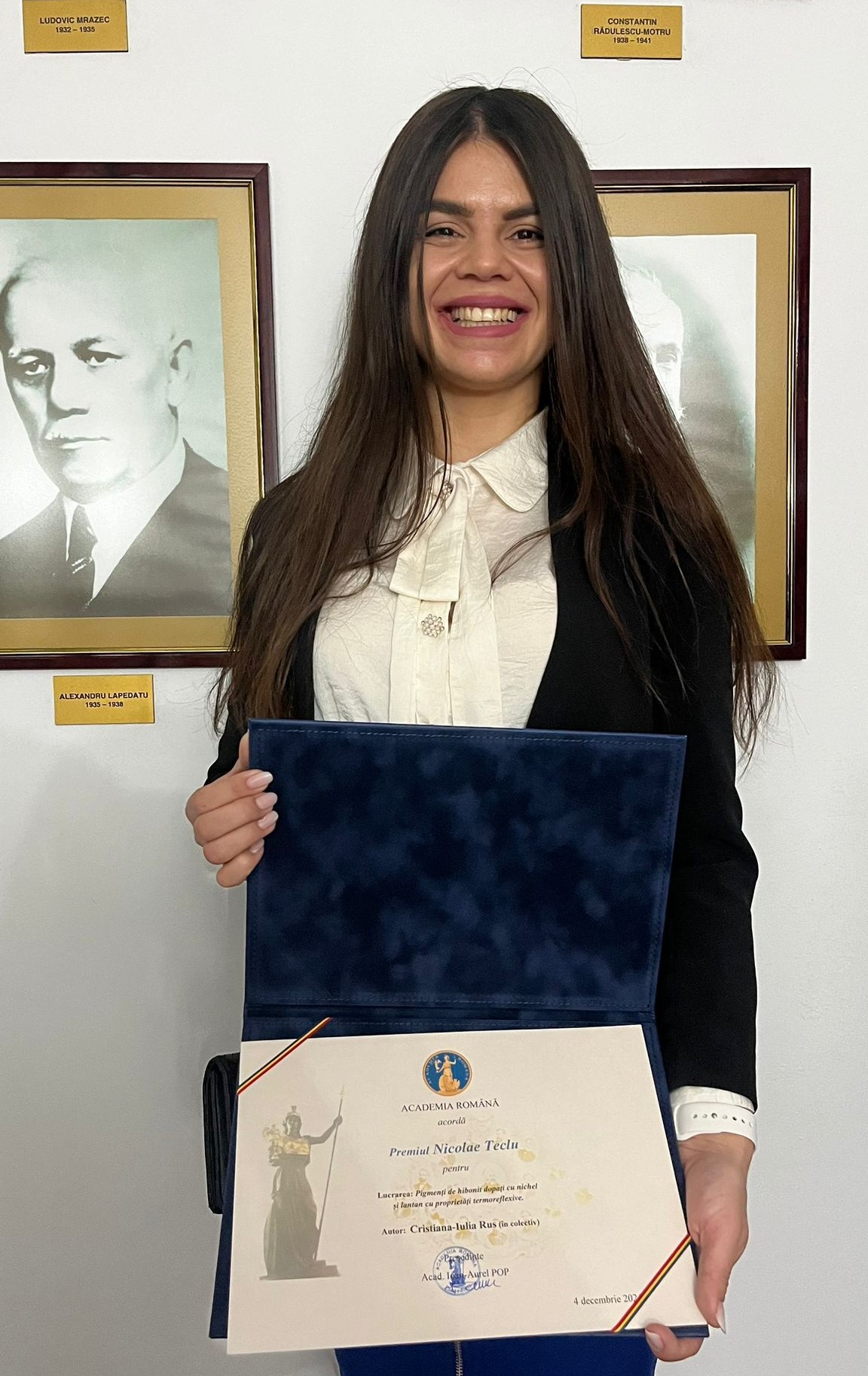În cadrul secțiunii Științe Chimice, Premiul „Nicolae Teclu” a revenit unui colectiv de cadre didactice de la Facultatea de Inginerie Chimică, Biotehnologii și Protecția Mediului a Universității Politehnica Timișoara, format din Robert-Gabriel Ianoș, Cristiana-Iulia Rus, Radu-Ioan Lazău, Cornelia-Silvia Păcurariu, recompensați pentru lucrarea cu titlul „Near-infrared reflective Ni, La-doped hibonite pigments for cool blue coatings”.