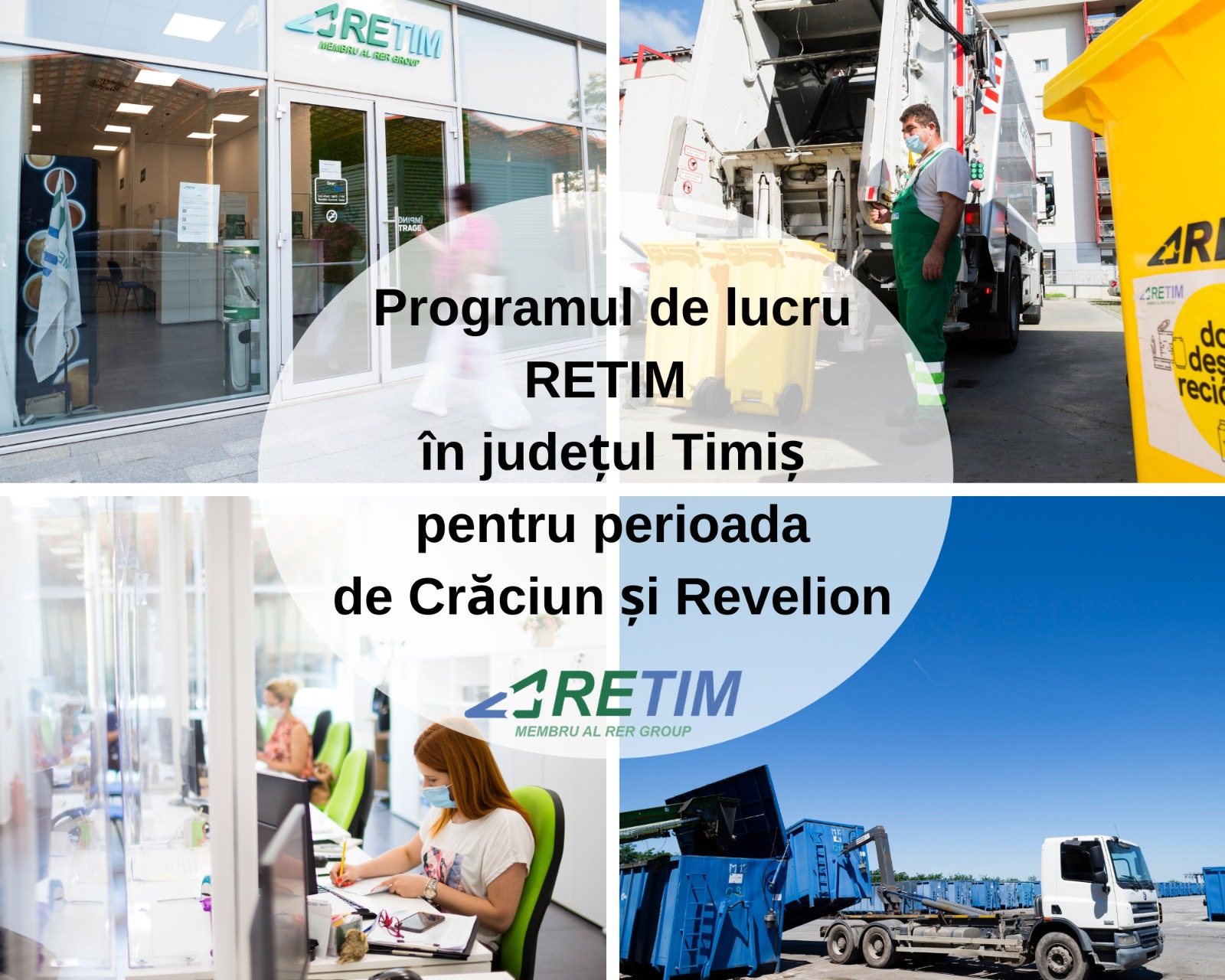 Activitatea de colectare a deşeurilor din toate localităţile din județul Timiș în care operează compania RETIM se va desfăşura conform PROGRAMELOR ZILNICE OBIŞNUITE. Nu există modificări faţă de orarele curente. Utilizatorii serviciului de salubrizare sunt rugați să scoată la stradă recipientele de colectare a deșeurilor în zilele obișnuite ale săptămânii.