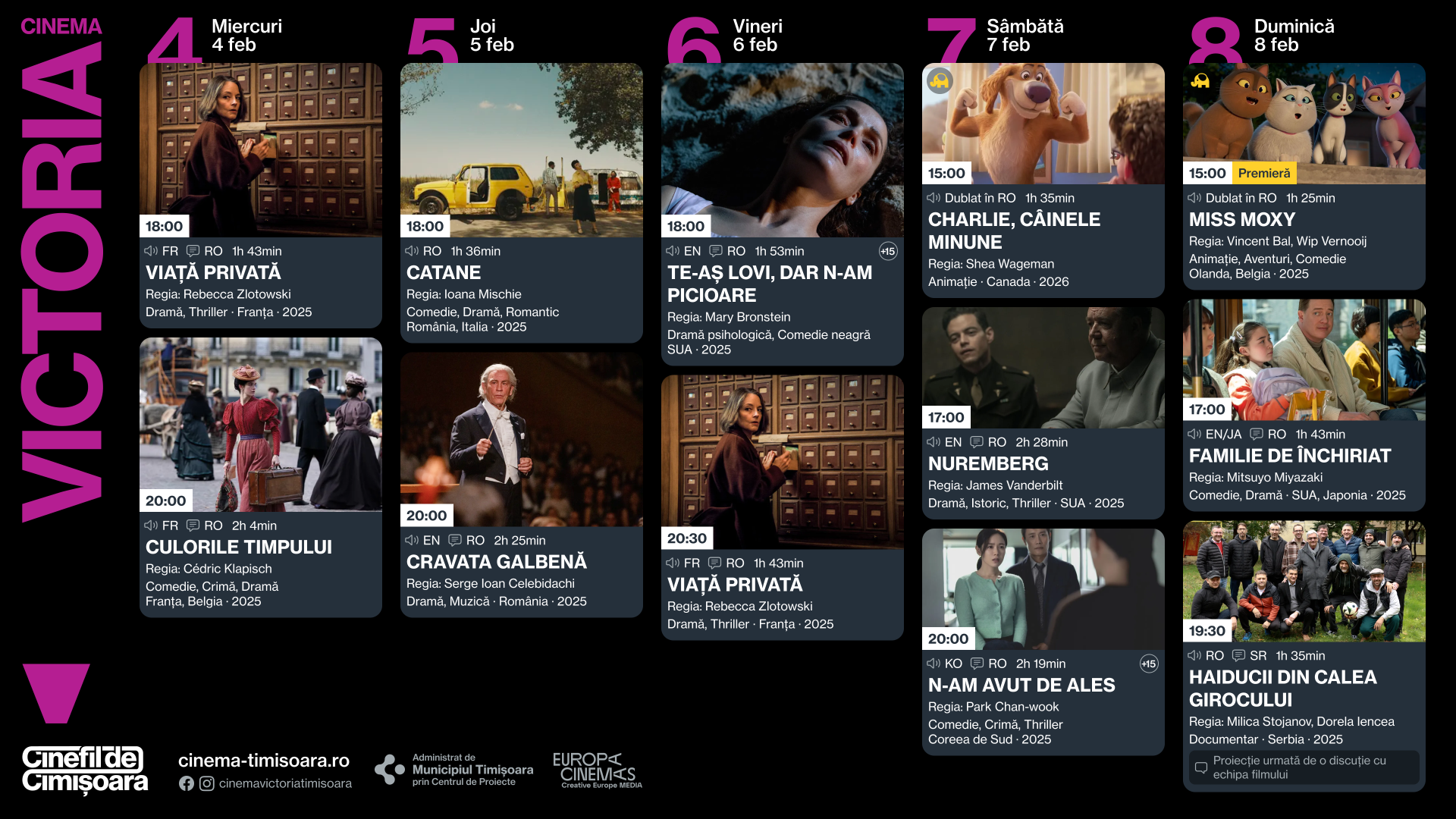 Programul săptămânii 4 – 8 februarie, la Cinema Victoria, Cinema Timiș, Cinema Studio și Cinema Johnny, include o varietate de titluri actuale, filme de cinemateca și filme independente, prin care organizatorii își propun să aducă un public cât mai numeros și variat în sălile de tradiție ale orașului.