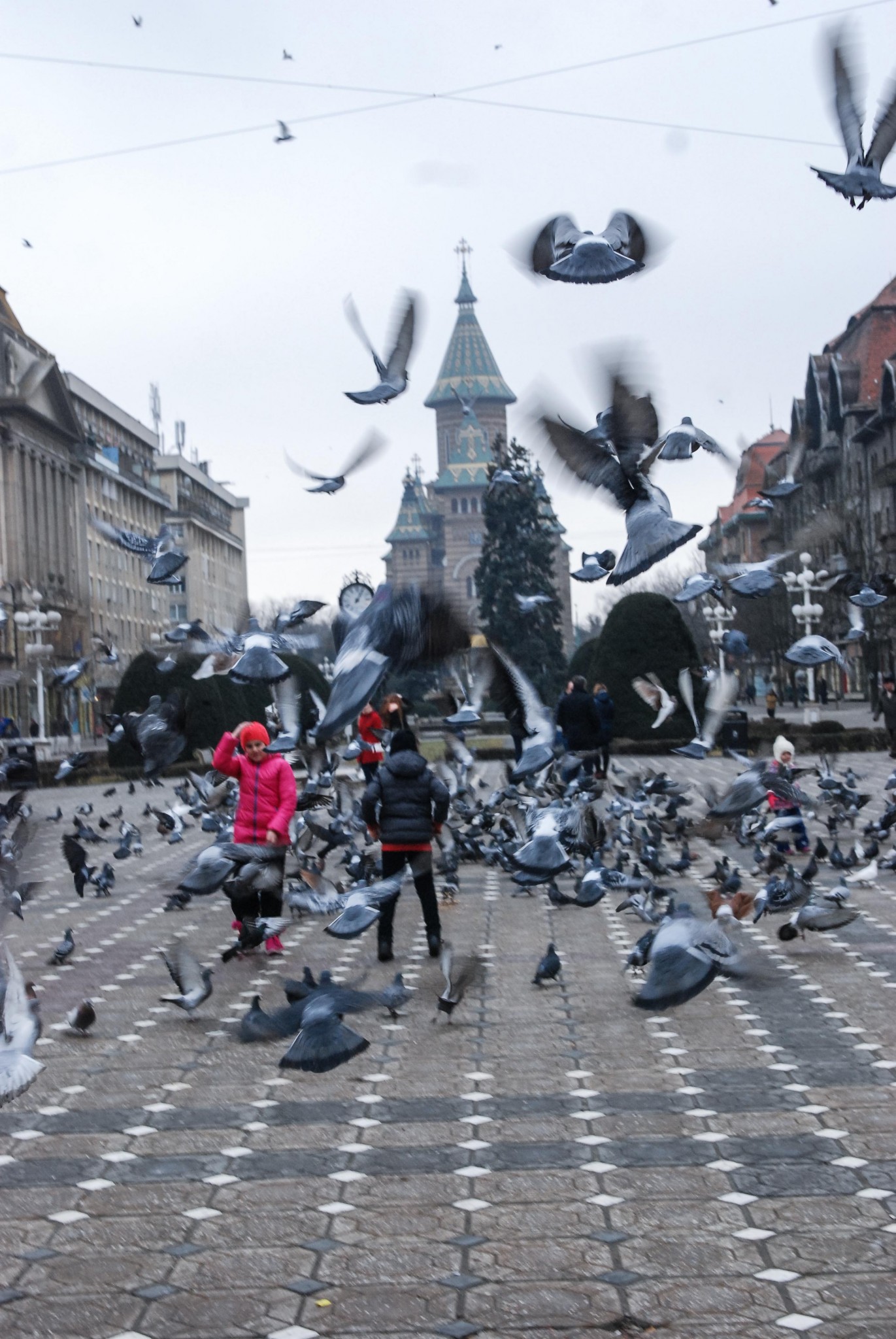 Nu au fost prea mulți părinți cu copii care să hrănescă porumbeii, poate din cauză frigului umed. Chiar și așa au adus o notă de inedit în contrast cu serile de încrancenare contestatară. Au fost pregătite pungi cu grâu dar și banderole cu deja celebrele slogane „rezist”. Și pentru că au mai rămas boabe în plus, au mers și la porumbeii din piața Libertății. Nu au lipsit nici baloanele colorate, atât de dorite de copii.
