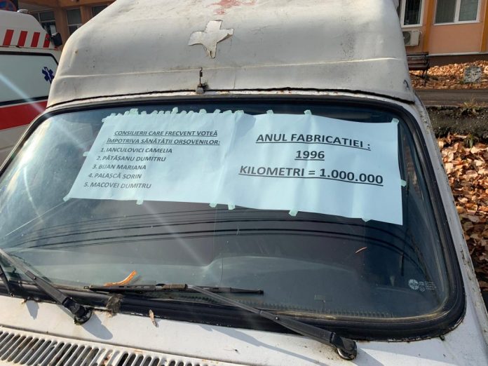 „Anul fabricației – 1996, kilometri – 1.000.000; Consilierii care frecvent votează împotriva sănătății orșovenilor: Ianculovici Camelia, Pătășanu Petre, Bijan Mariana, Palașcă Sorin, Macovei Dumitru” – asta scrie pe parbrizul unei Dacii papuc, aproape ruginite.