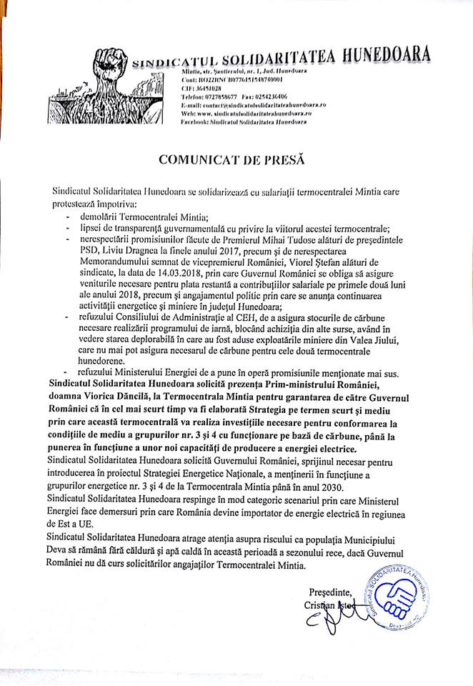 Circa 130 de angajați, cei din schimbul al treilea și cei din schimbul I, solicită prezența premierului la Complexul Energetic Hunedoara.„Sindicatul Solidaritatea Hunedoara solicită prezența prim-ministrului României, doamna Viorica Dăncilă, la Termocentrala Mintia, pentru garantarea de către Guvernul României că în cel mai scurt timp va fi elaborată strategia pe termen scurt și mediu prin care această termocentrală va realiza investițiile necesare pentru conformarea la condițiile de mediu a grupurilor 3 și 4 cu funcționare pe bază de cărbune, până la punerea în funcțiune a unor noi capacități de producere a energiei electrice”, a declarat miercuri Cristian Iștoc, președintele Sindicatului Solidaritatea.