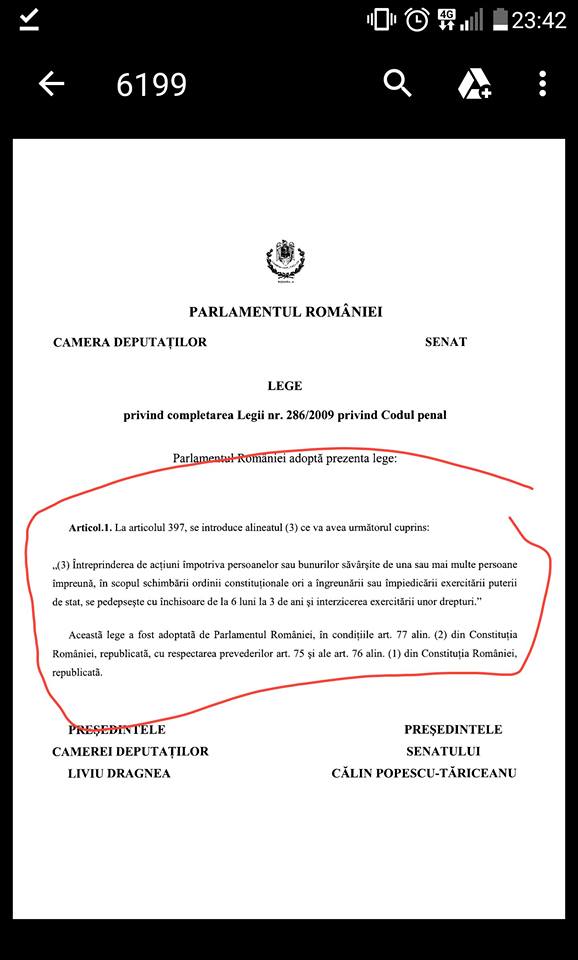 Un proiect de lege care prevede pedepsirea protestatarilor cu închisoare între șase luni și trei ani dacă prin manifestarea lor „au scopul de a schimba ordinea constituțională ori să îngreuneze sau să împiedice exercitarea puterii de stat” a ajuns în Senatul României. Inițiatorul proiectului este deputatul PSD Tudor Ciuhodaru.