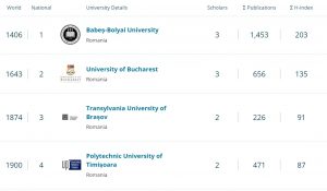 Research.com, unul dintre cele mai importante portaluri dedicate cercetătorilor/oamenilor de știință din universități, a dat publicității clasamentul celor mai bune universități în 2022, în care sunt incluse în premieră și instituții de învățământ superior din România, principalul criteriu de departajare fiind suma valorilor indicelui H ale tuturor oamenilor de știință de frunte asociați cu o anumită universitate. Un om de știință de frunte este un cercetător cu un indice D (indicele H de disciplină) mai mare decât un anumit prag (în majoritatea cazurilor 30 sau 40) pentru domeniile lor de studiu.