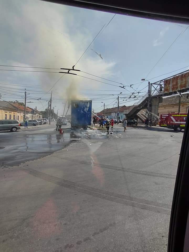 Remorca unui TIR a luat foc, miercuri după masă, la intersecția străzilor Gării și Pop de Băsești. Din primele informații, camionul ar fi agățat firele de troleibuz și așa a fost declanșat focul.