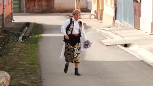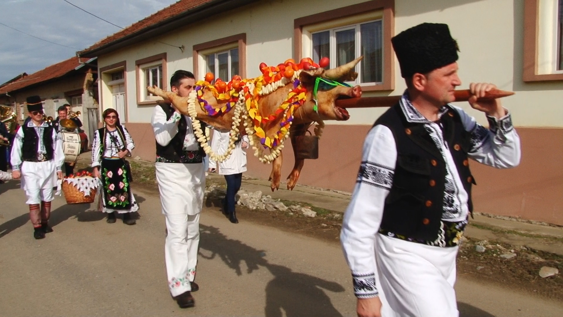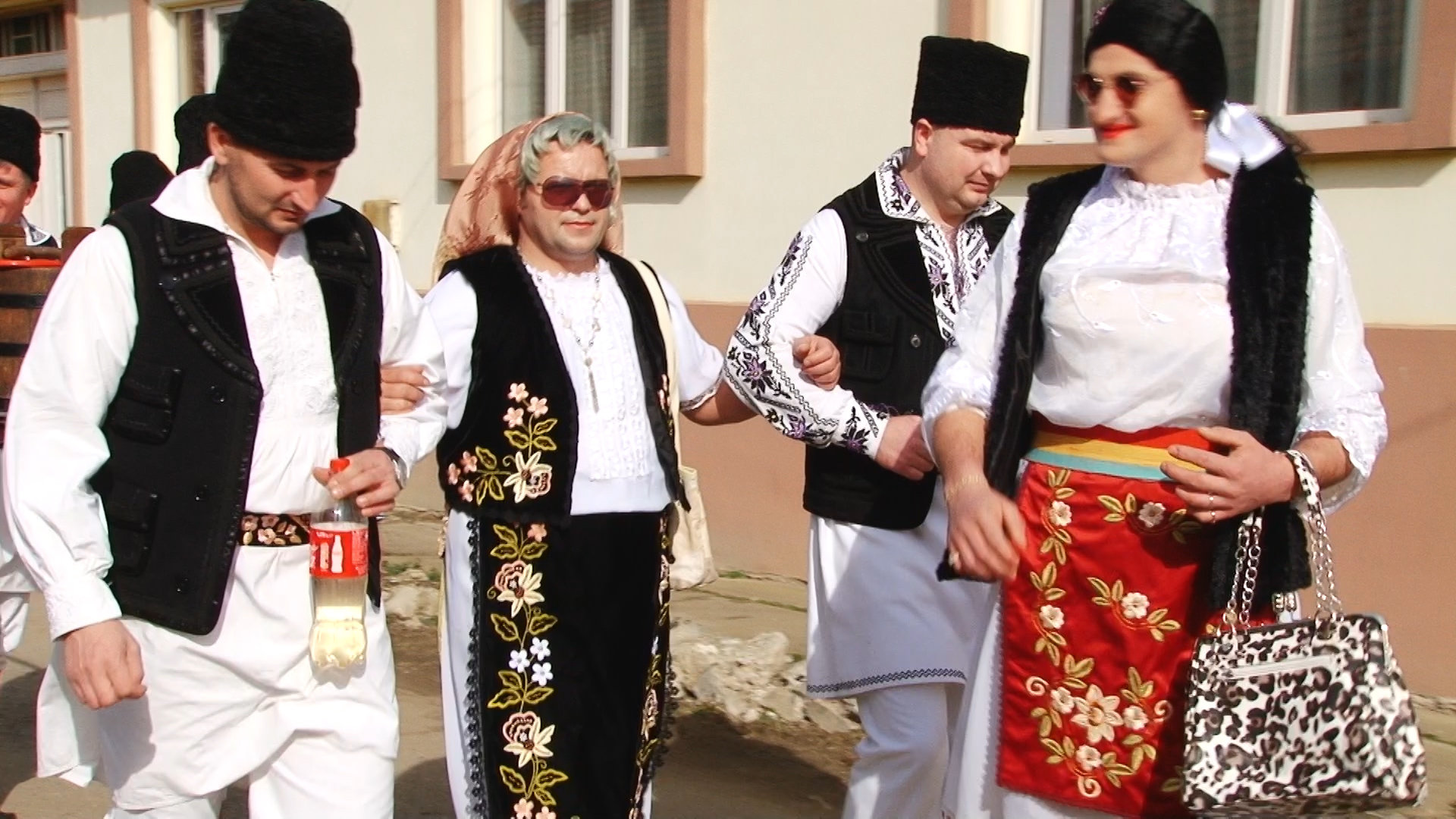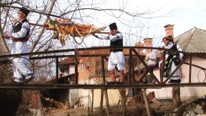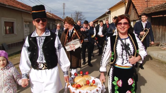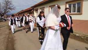 Există și o mireasă! Alaiul colindă satul cu steaguri și uiege de răchie în mână în sunetele muzicii. Dar și adună într-un butoiaș răchia oferită cu generozitate de săteni pentru balul de seară. Femeile satului sunt doar admise să admire trăsnăile, nu au de jucat nici un rol.