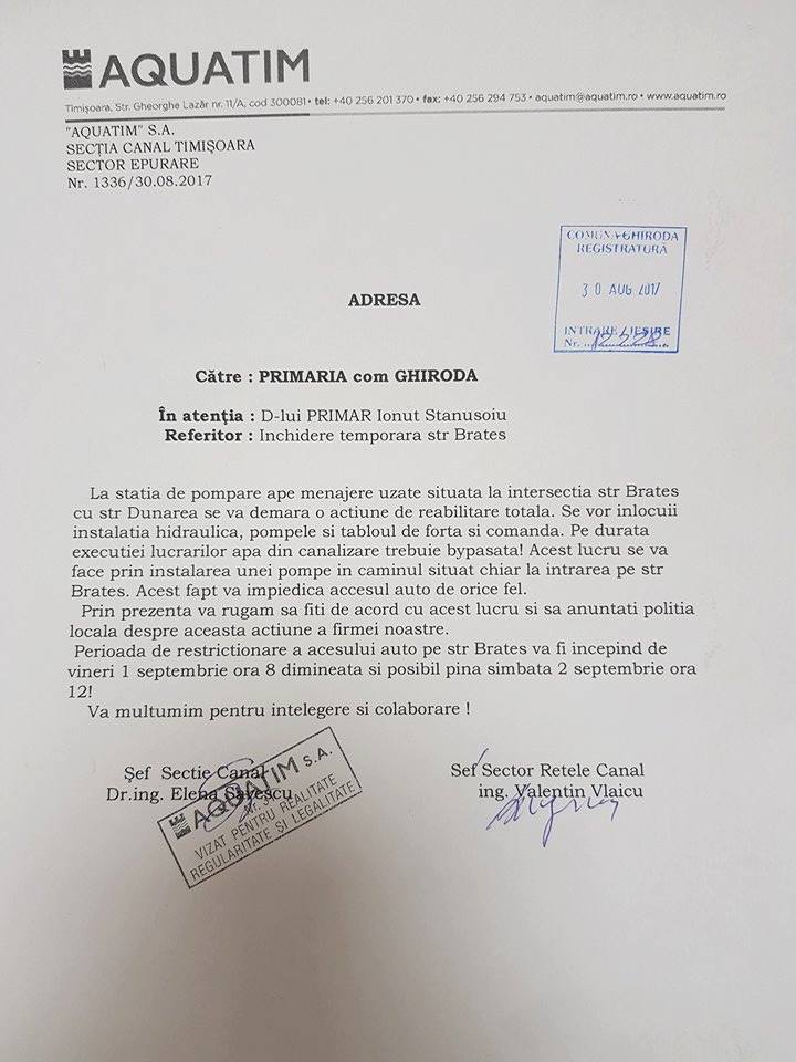 ,,Conform adresei atașate, vineri 1 septembrie și sâmbătă (până în jurul prânzului) accesul auto pe strada Brateș (de pe str. Dunărea) va fi restricționat în vederea unor lucrări de reabilitare la stația de pompare a apei menajere uzate.”
