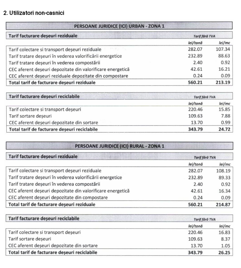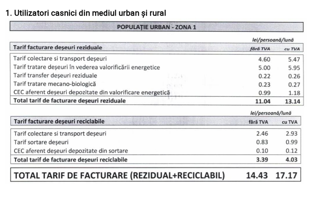Conform noii legislații în domeniu (Ordinul nr. 640/2022, OUG 133/2022), operatorul este obligat să prezinte tarifele practicate către utilizatorii serviciului de salubritate pe toate componentele acestuia.