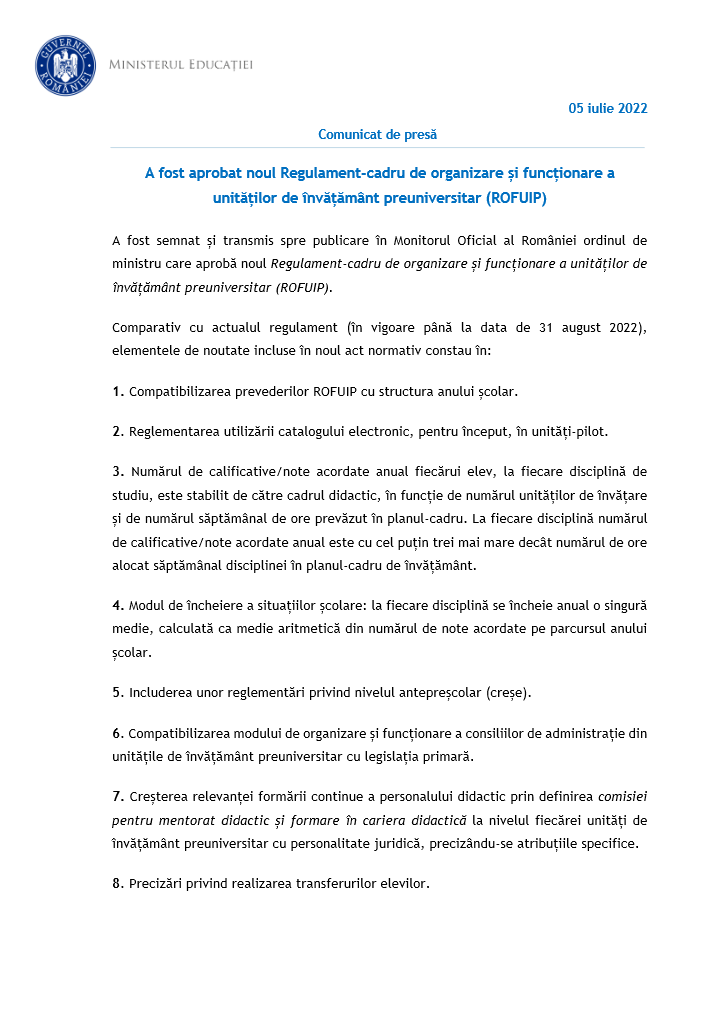 Unitățile de învățământ preuniversitar vor funcționa, de la toamnă, după un nou regulament. Acesta a fost semnat şi transmis spre publicare în Monitorul Oficial, a anunțat marți Ministerul Educaţiei.