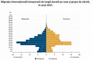 Migraţia internaţională temporară de lungă durată pe sexe şi grupe de vârstă, în anul 2015