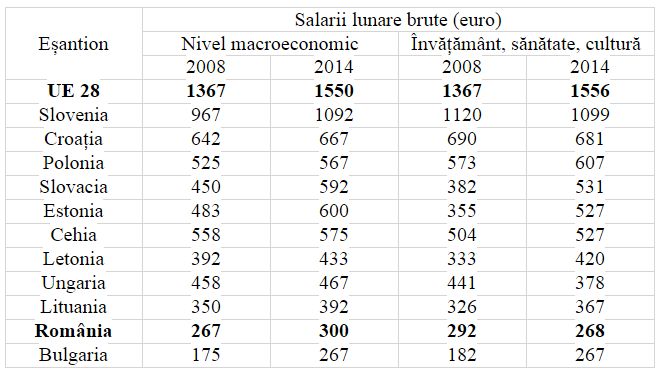 Mai întâi, salariile lunare brute cuantificate în euro din instituțiile românești de învățământ, sănătate și cultură au scăzut în perioada 2008 – 2014 cu 8,2% ( 292 euro în 2008 vs 268 euro în 2014). Și chiar dacă luăm în considerare cuantificarea în euro pps (euro pps fiind o monedă convențională cu aceeași putere de cumpărare în toate statele din UE) nivelul salariilor menționate a crescut nesemnificativ: 526 euro pps în 2008 vs 538 euro pps în 2014. În aceeași perioadă, salariile lunare brute din instituțiile bulgare de învățământ, sănătate și cultură au crescut în cazul etalonului monetar euro cu 46,7% (182 euro în 2008 vs 267 euro în 2014), respectiv cu 35,7% în cazul etalonului monetar euro pps (426 euro pps în 2008 vs 578 euro pps în 2014) (1,2).