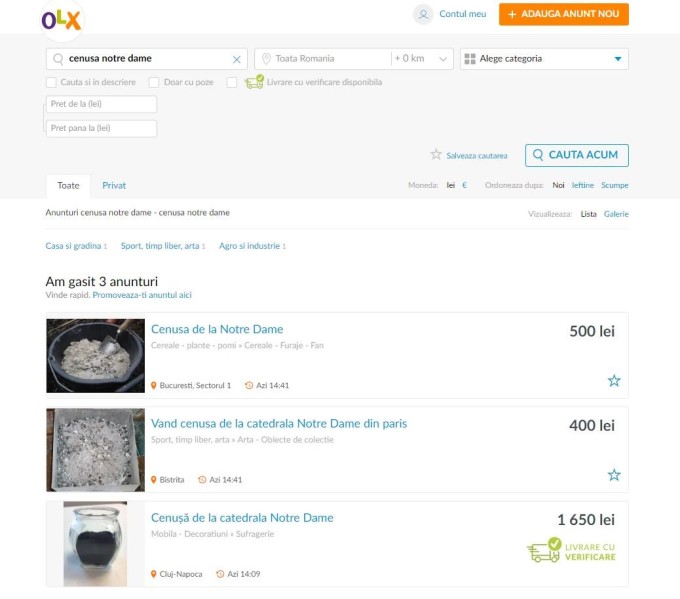 Potrivit Profit.ro, pe site-urile de vânzări din România au început să se îmulțească anunțurile în care se vinde „cenușă de la Notre-Dame”, la prețuri de câteva sute de lei.