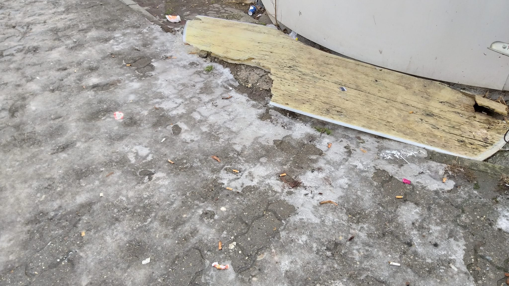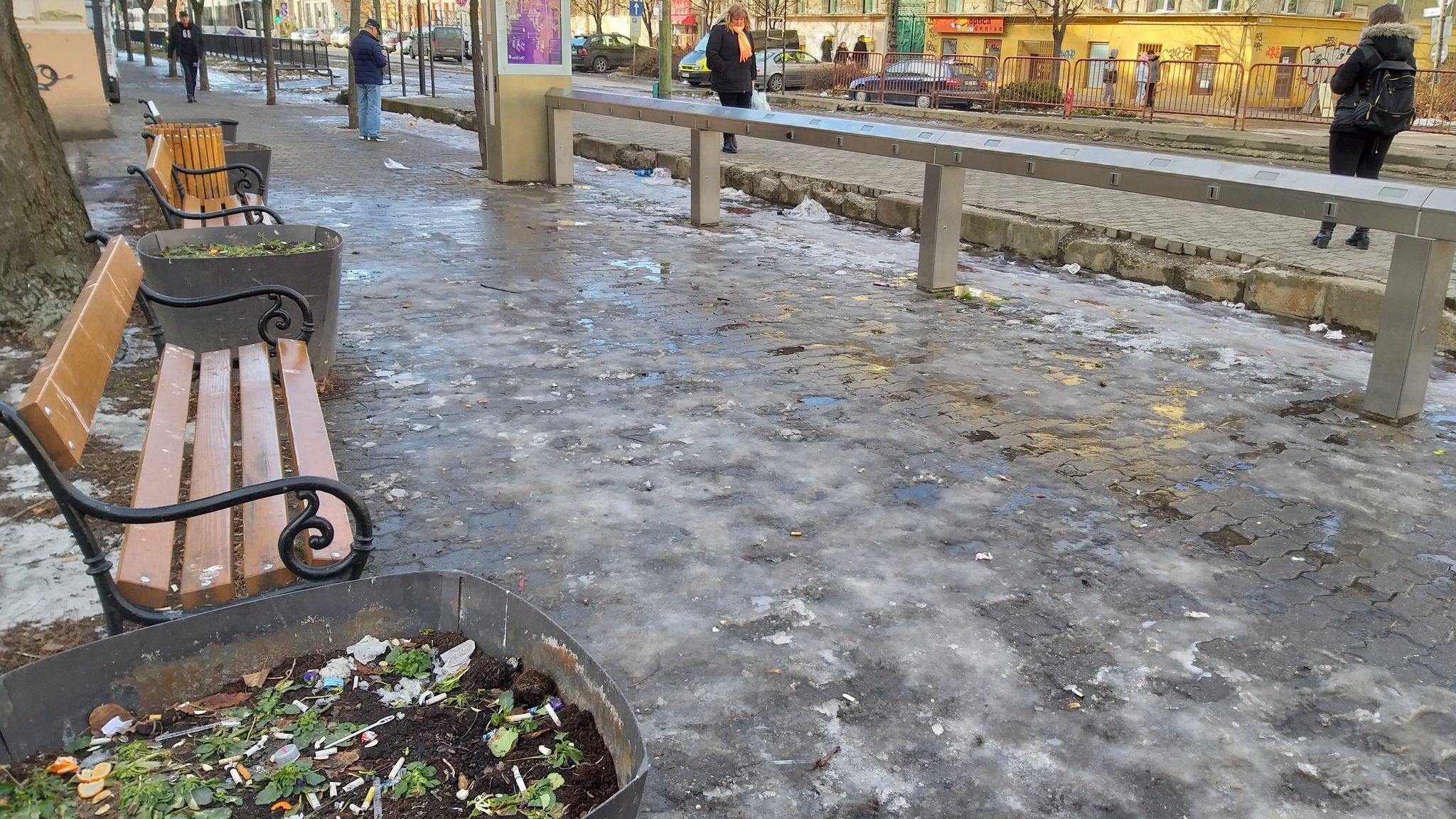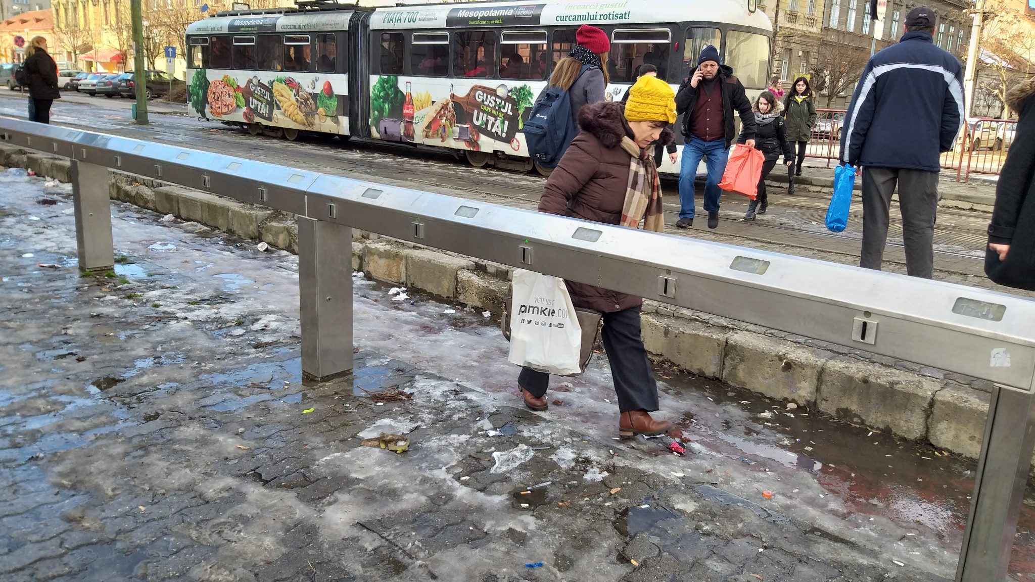 Stațiile de transport în comun erau dotate într-un trecut nu prea îndepărtat cu lăzi cu nisip și sare. Acum după modernizare nici măcar copertina de protecție nu mai există darămite lada bună la orice alunecuș cât de îndărătnic.