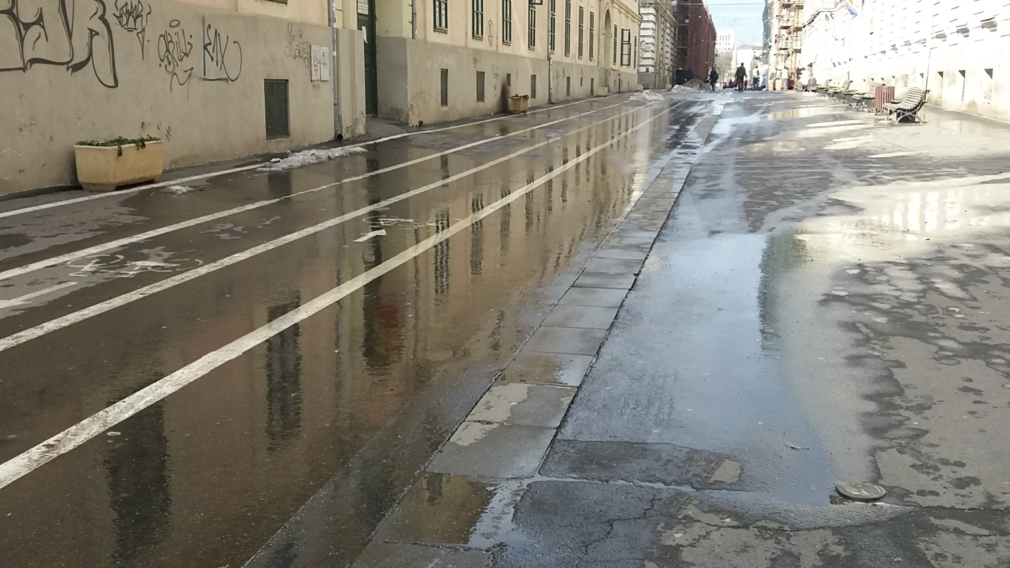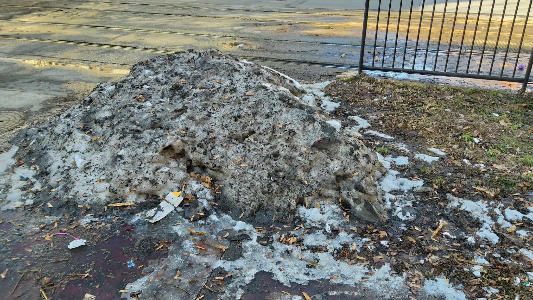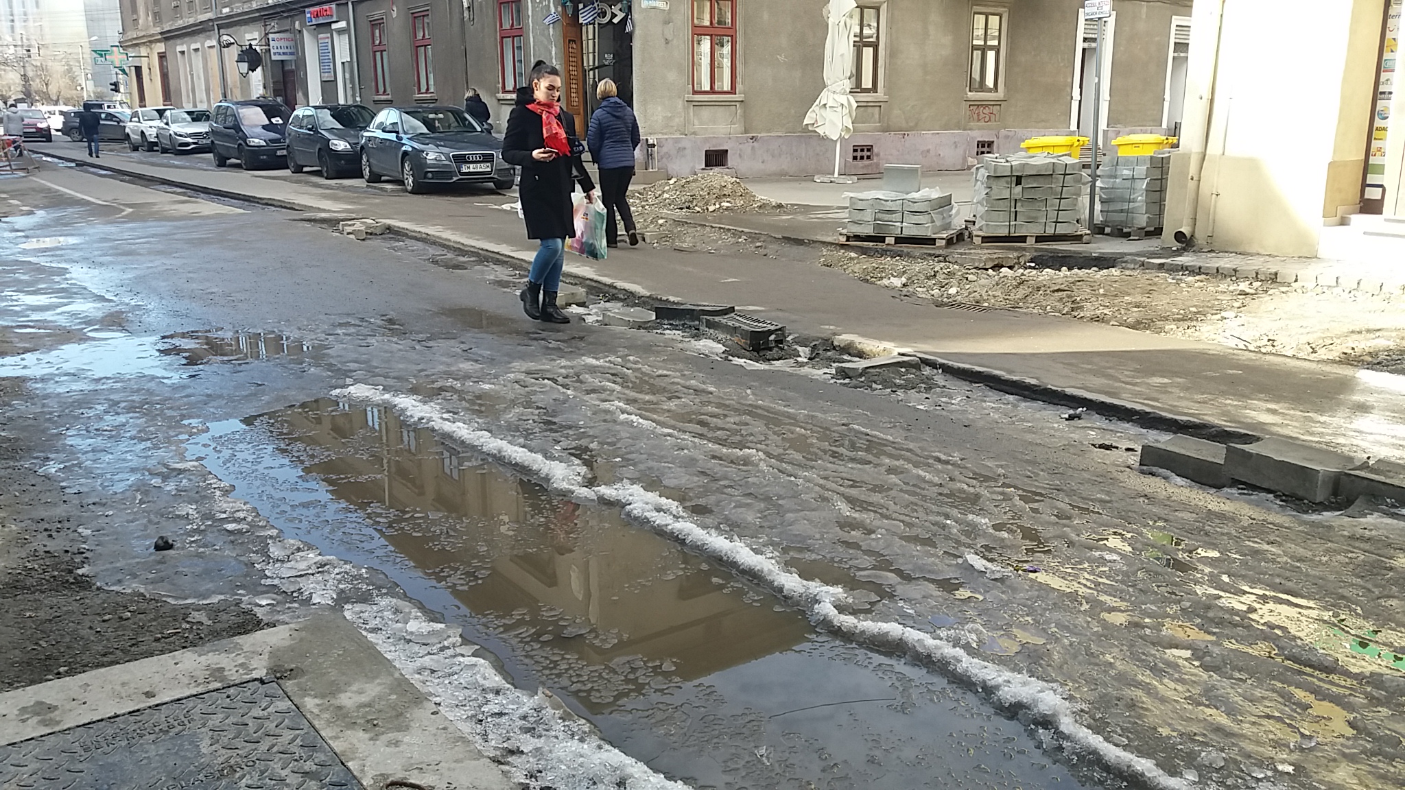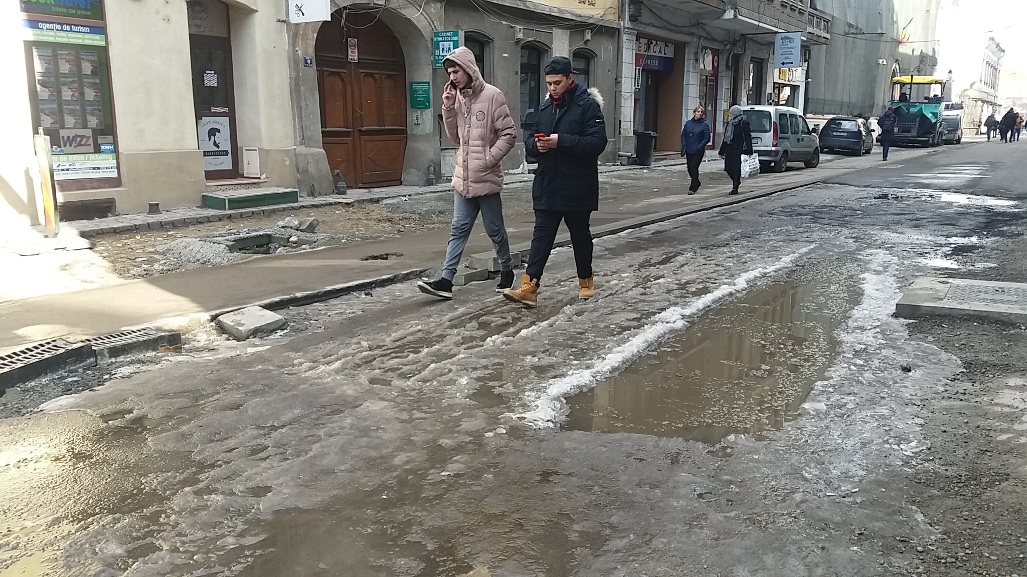 Timp de două săptămâni, zăpada căzută în mai multe tranșe inegale s-a așezat, bătătorit, topit și iar a înghețat la loc dând naștere la forme de relief de o stranie conformație. Constanta lor este că albul zăpezii a prins culori din cele mai mizere. Toate nuanțele de gri și de culoare incertă a noroiului se găsesc în ghețurile de pe trotuare sau de la intersecții. Cele mai spectaculoase alunecușuri s-au format pe poduri după ploile de mai acum câteva zile.