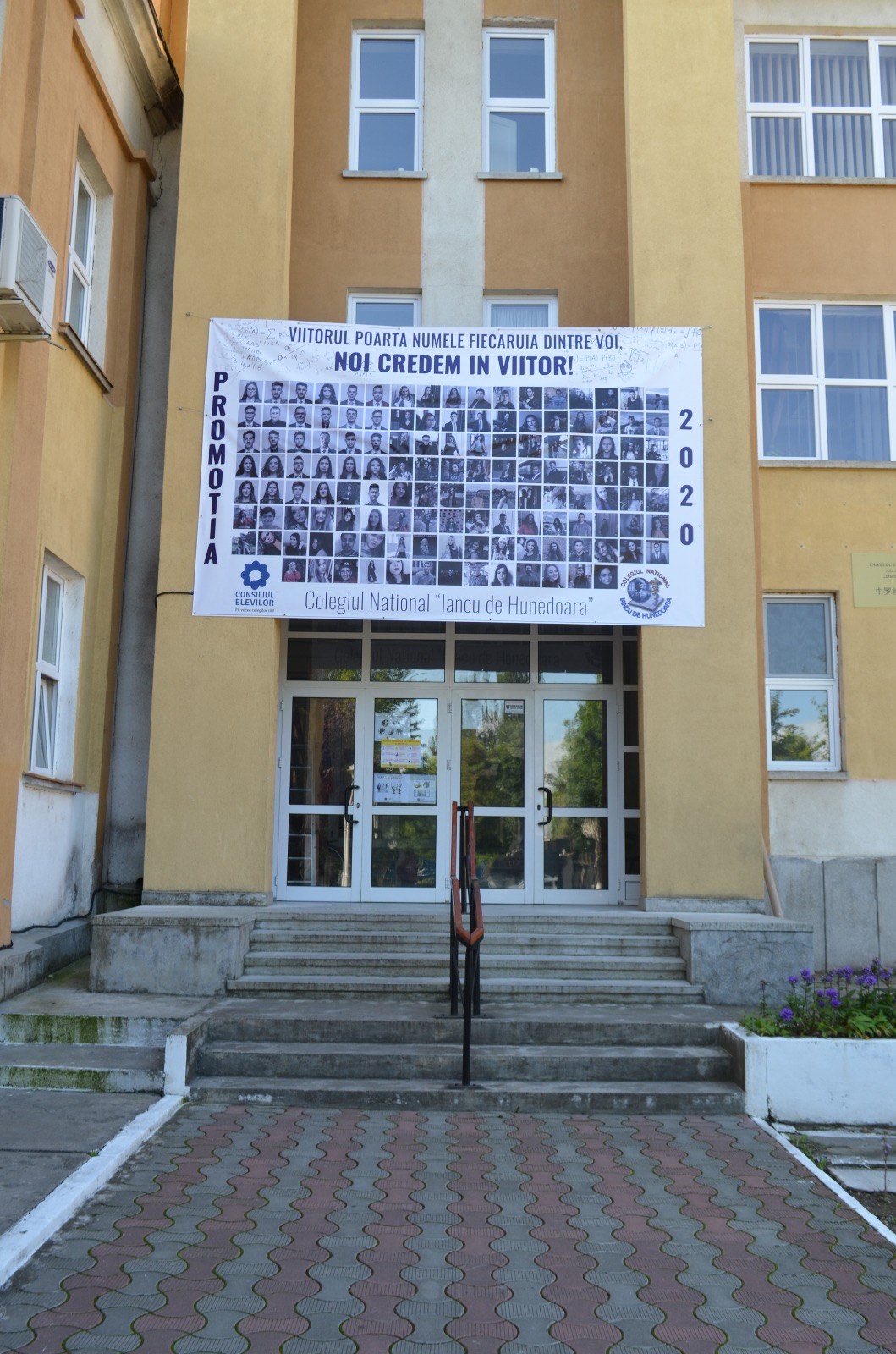 Un banner imens pe care au fost imprimate fotografii ale absolvenților din promoția 2019-2020 de la Colegiul Național „Iancu de Hunedoara” a fost desfășurat pe pereții liceului.