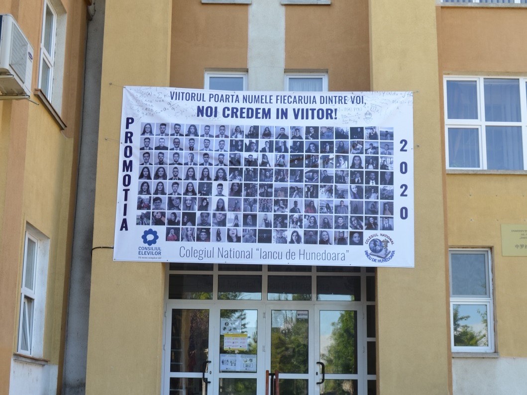 Un banner imens pe care au fost imprimate fotografii ale absolvenților din promoția 2019-2020 de la Colegiul Național „Iancu de Hunedoara” a fost desfășurat pe pereții liceului.