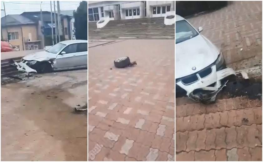În urma impactului deosebit de puternic, bucăţi din autoturismul BMW s-au împrăştiat pe o zonă destul de mare, iar şoferul a fugit de la locul accidentului. Potrivit martorilor, şoferul ar fi avut o viteză deosebit de mare, maşina zburând de pe şosea, după care a lovit un panou publicitar, apoi a aterizat pe scările Sălii Sporturilor.