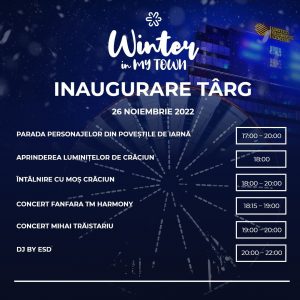 Târgul „Winter in MY TOWN” va fi deschis zilnic până pe 8 ianuarie 2023, de luni până vineri, între orele 16.00 – 22.00 și sâmbătă – duminică, între orele 12.00 – 22.00.