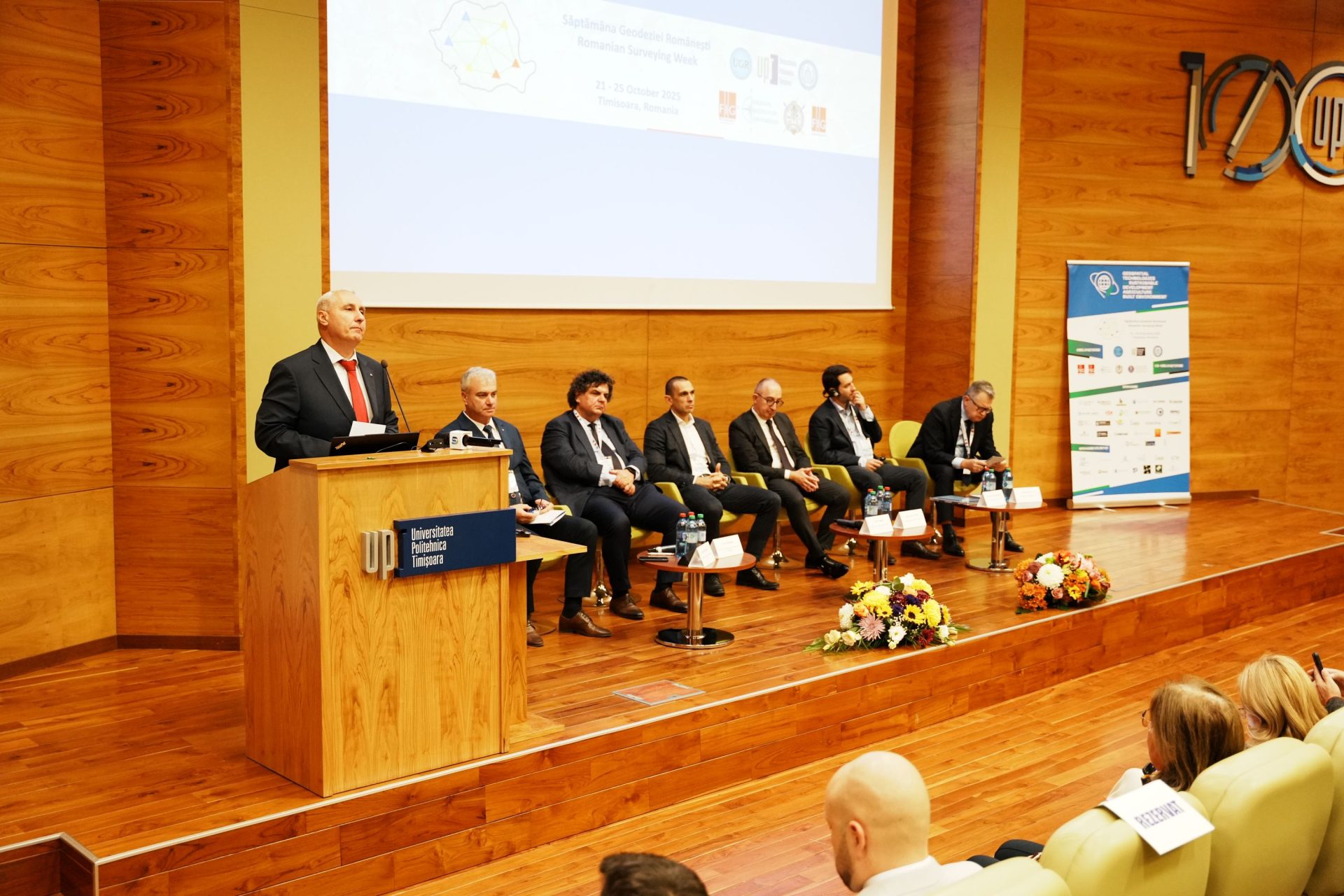 În cadrul deschiderii oficiale de la Universitatea Politehnica Timișoara, mesaje de salut au fost adresate participanților de către ing. Mircea Afrăsinei, președintele Uniunii Geodezilor din România, conf.univ.dr.ing. Florin Drăgan, rectorul Universității Politehnica Timișoara, conf.univ.dr. Dorin Camen, prorector al Universității de Științele Vieții „Regele Mihai I”, Florin Sava, conilier în cadrul Ministerului Educației și Cercetării, Mircea Viorel Popa, director general adjunct al Agenției Națională de Cadastru și Publicitate Imobiliară, Michalis Kalogiannakis, vicepreședinte al Federației Internaționale a Geodezilor, Liliana Oneț, subprefect de Timiș, Mircea Stoian, președinte al Patronatului societăților din topografie, fotogrametrie, geodezie, cadastru și GIS (Patrocad), Dănuț Dorin Miculescu, reprezentant al Camerei Notarilor Publici Timișoara, Aleksandar Miloavlevic, de la Asociația Geodezilor din Serbia, Valeriu Manolache, președintele Asociației Patronale de Cadastru, Geodezie și Cartografie, și prof.univ.dr.ing. Sorin Herban, prodecan al Facultății de Construcții de la Universitatea Politehnica Timișoara, care au subliniat, în luările de cuvânt, importanța colaborării între mediul academic, mediul privat și administrație, arătând, în acelai timp, că geodezia nu înseamnă doar măsurători și hărți, ci fundamentul oricărui proiect de infrastructură, dezvoltare urbană sau amenajare teritorială.