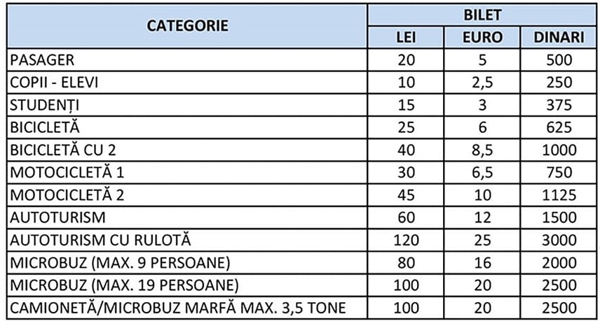 Tarifele din tabel sunt pentru o singură călătorie, deci un drum dus-întors costă dublu.