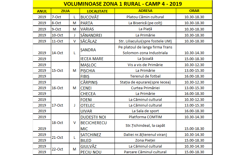 Cetățenii din aceste localități vor putea depune prin aport voluntar în containerele special puse la dispoziție în punctele de colectare menționate în tabelele atașate deșeurile voluminoase.