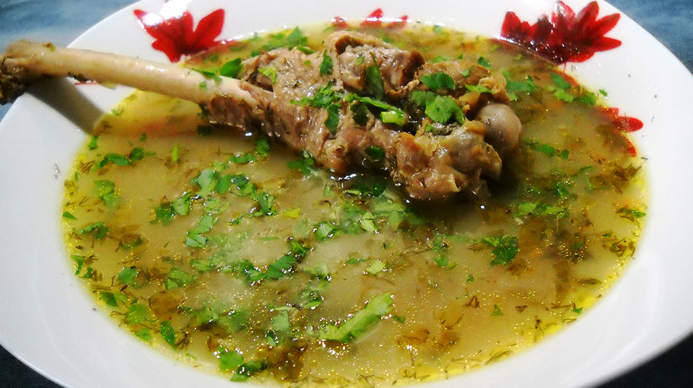 Se pune carne de gâscă la fiert (gât, aripi, spatele, târtiţa). După ce a dat câteva clocote şi am dat spuma la o parte, se pune zarzavatul tocat (ceapă, morcovi, păstârnac, pătrunjel, ţelină, ardei, roşii). Tot acum se adaugă şi sarea. După ce carnea şi zarzavatul au fiert bine, se fac zdrenţe de ou şi se condimentează cu pătrunjel, ţelină tocată şi (foarte puţin) chimen.