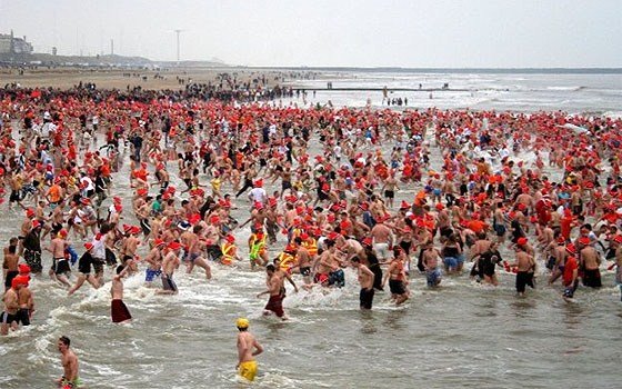 La Haga, unde a fost organizată cea mai mare intrare în apă, circa 10.000 de persoane au alergat spre mare la prânz, ieșind din apă după câteva secunde petrecute la 9 grade Celsius.