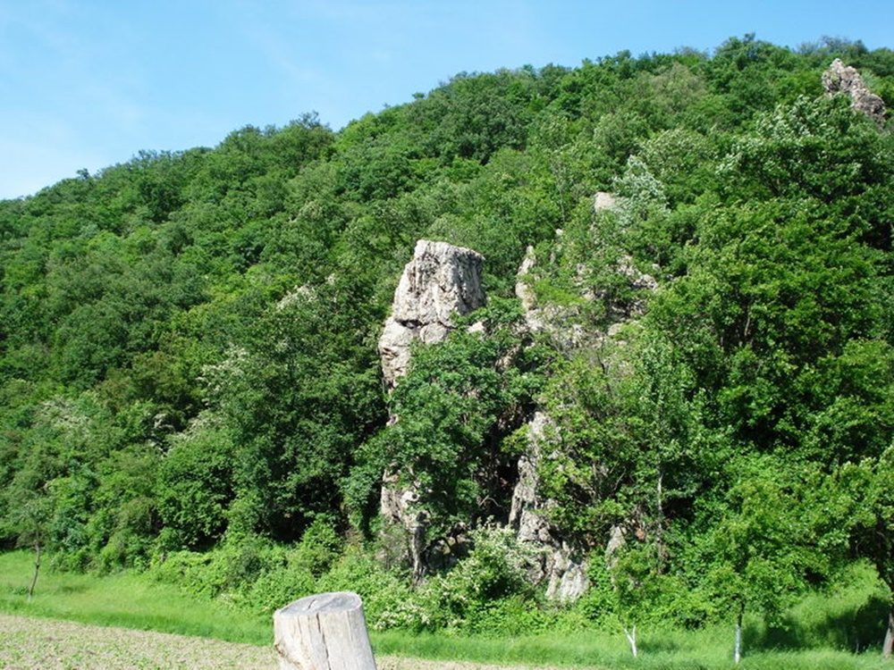 Sfinxul Bănățean este cu fața spre apus, pierdut printre copacii de la baza unui deal.