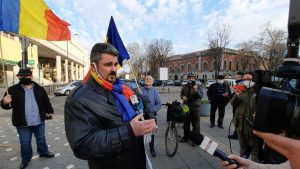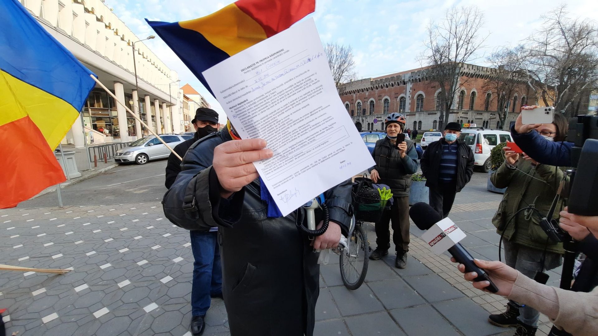 Puținii protestatari au venit cu steaguri și o lumânare. Au spus că o aprind în fața Operei Naționale Timișoara ca semn că libertatea a murit.