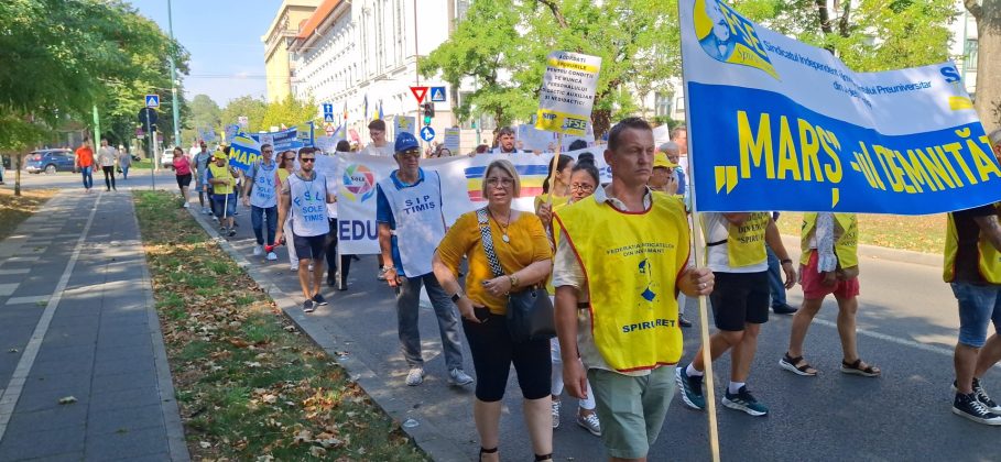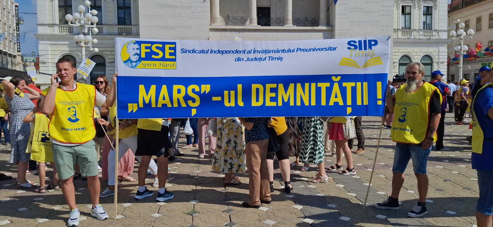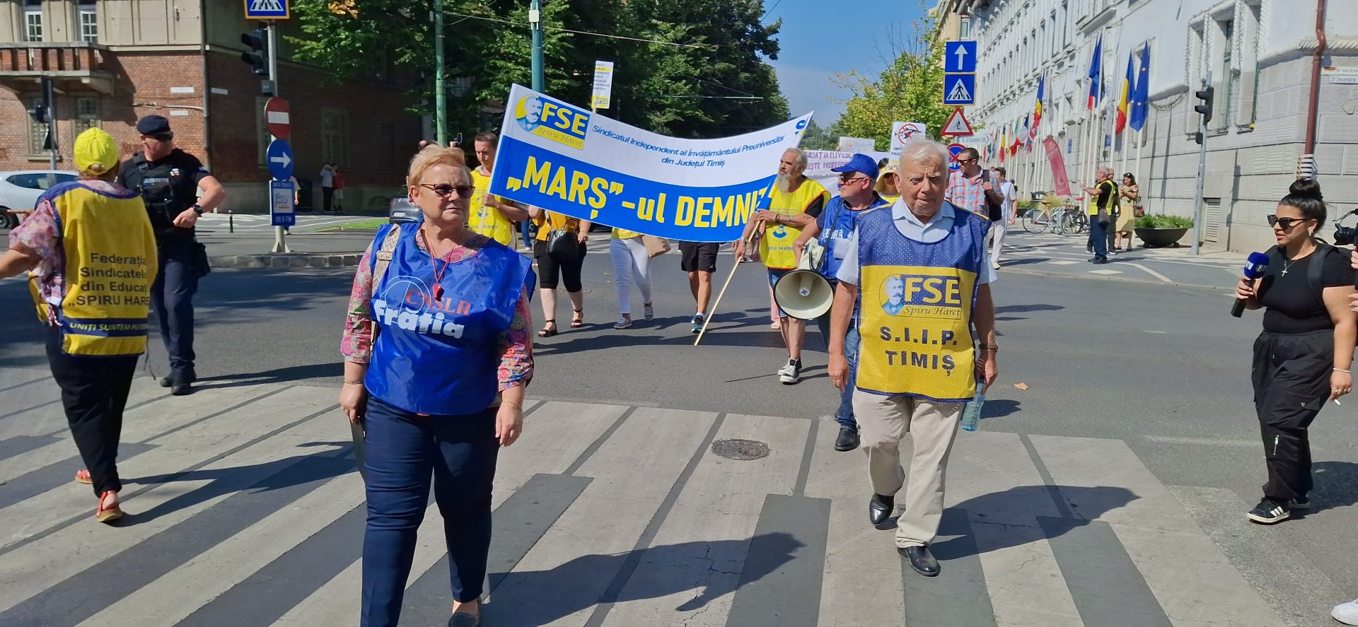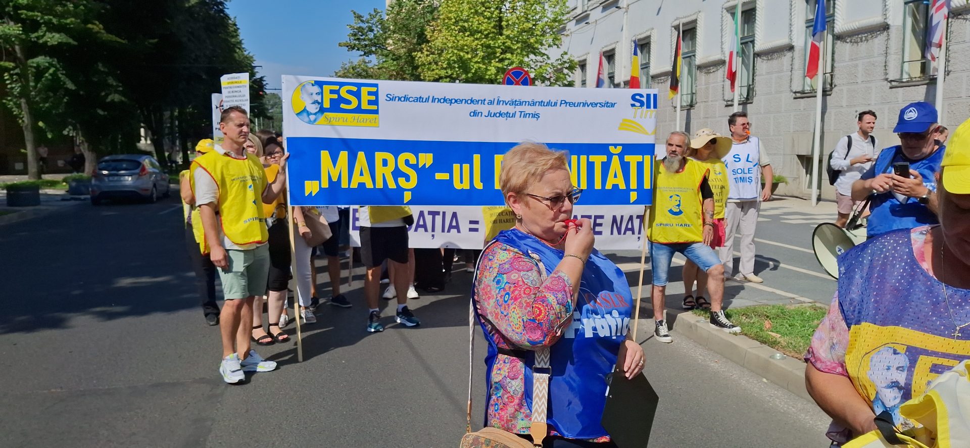 Vorbim pentru prima dată de șomaj masiv în sistemul de învățământ. La nivel național sunt peste 30.000 de posturi de cadre didactice și de cadre didactice auxiliare care au dispărut. Asta înseamnă foarte mult. Și având în vedere faptul că învățământul este prioritatea națională, așa cum bine știți, că tot declară toate partidele politice, dar de fapt suntem bătaia de joc a societății românesc. Pentru aceasta noi astăzi facem un marș al demnității, un marș a respectului, ca să se audă că și la Timișoara, ca de altfel în toate județele țării, în toate reședințele de județ, se fac asemenea acțiuni. Este un preludiu al marelui miting care va avea loc la București în data de 8, care privește de fapt și boicotarea începerii anului școlar, astfel încât poate guvernul se răzgândește și va abroga legea Bolojan.” a explicat contextul protestului Virgil Popescu, președinte executiv la sindicatul Spiru Haret.