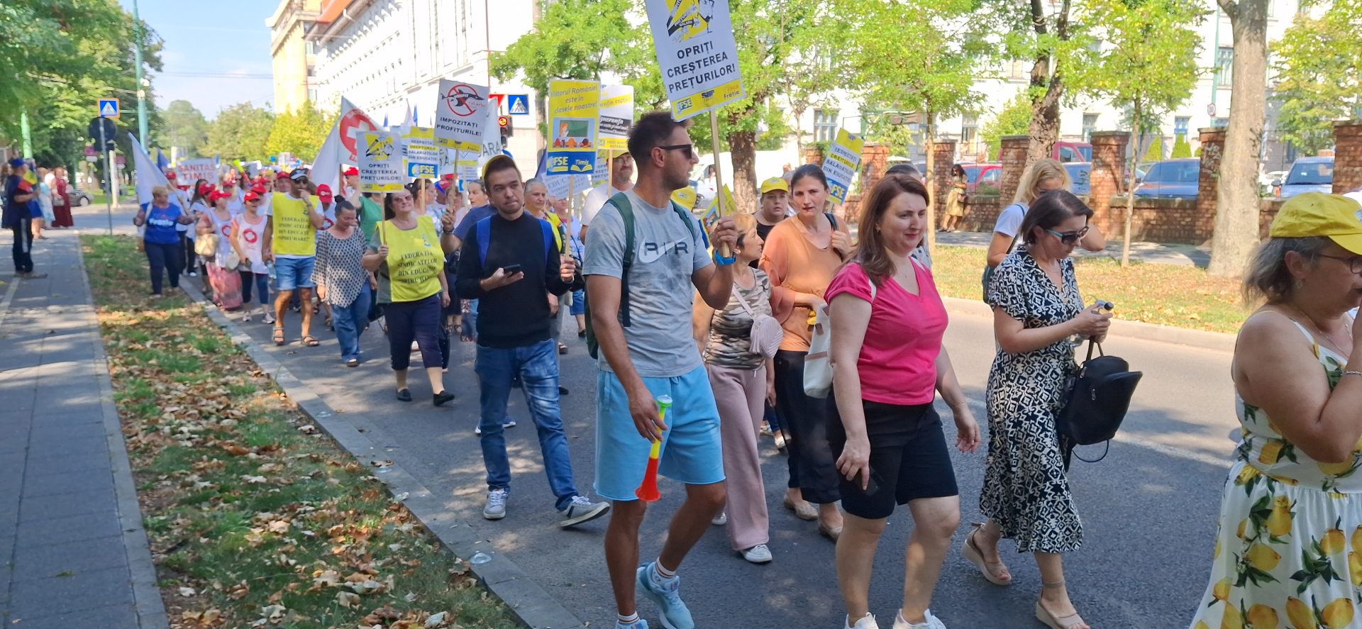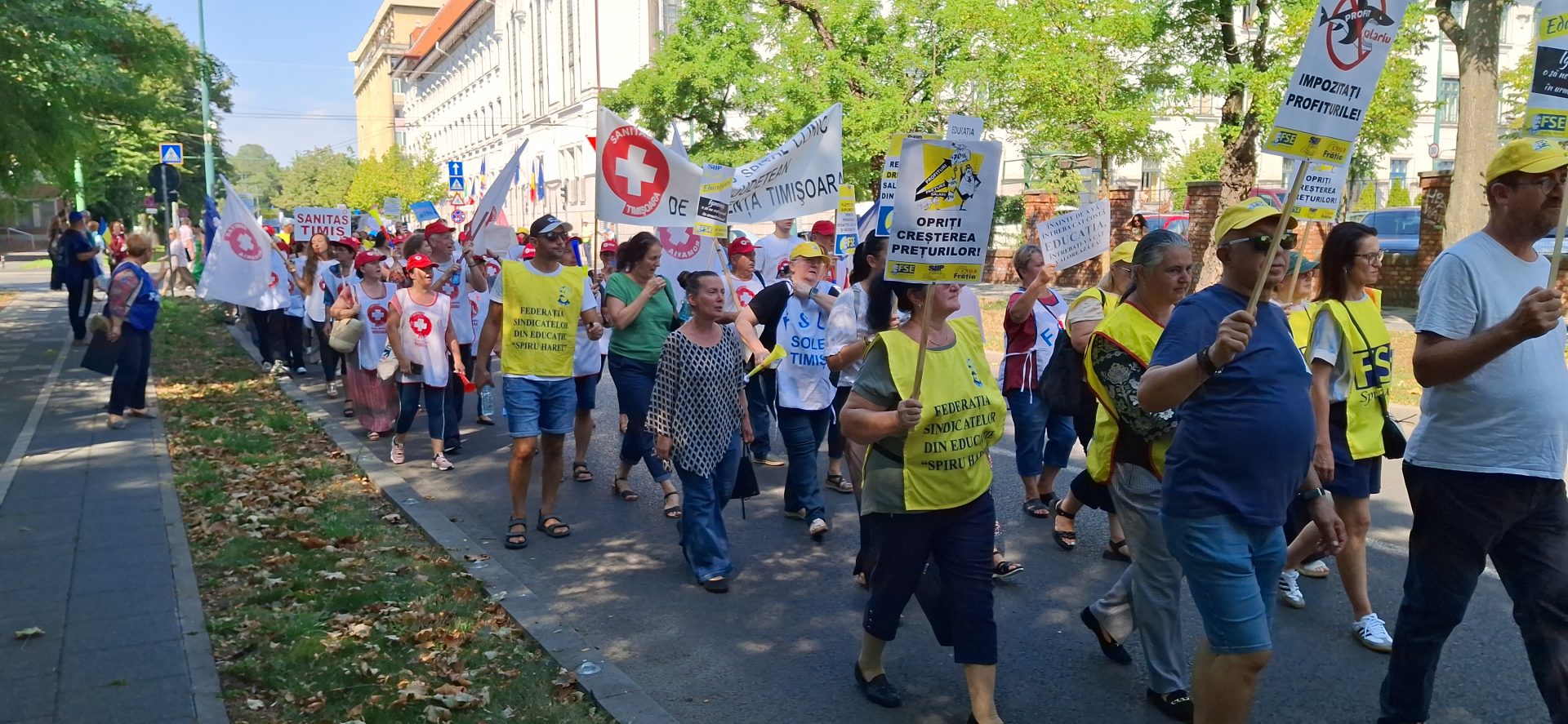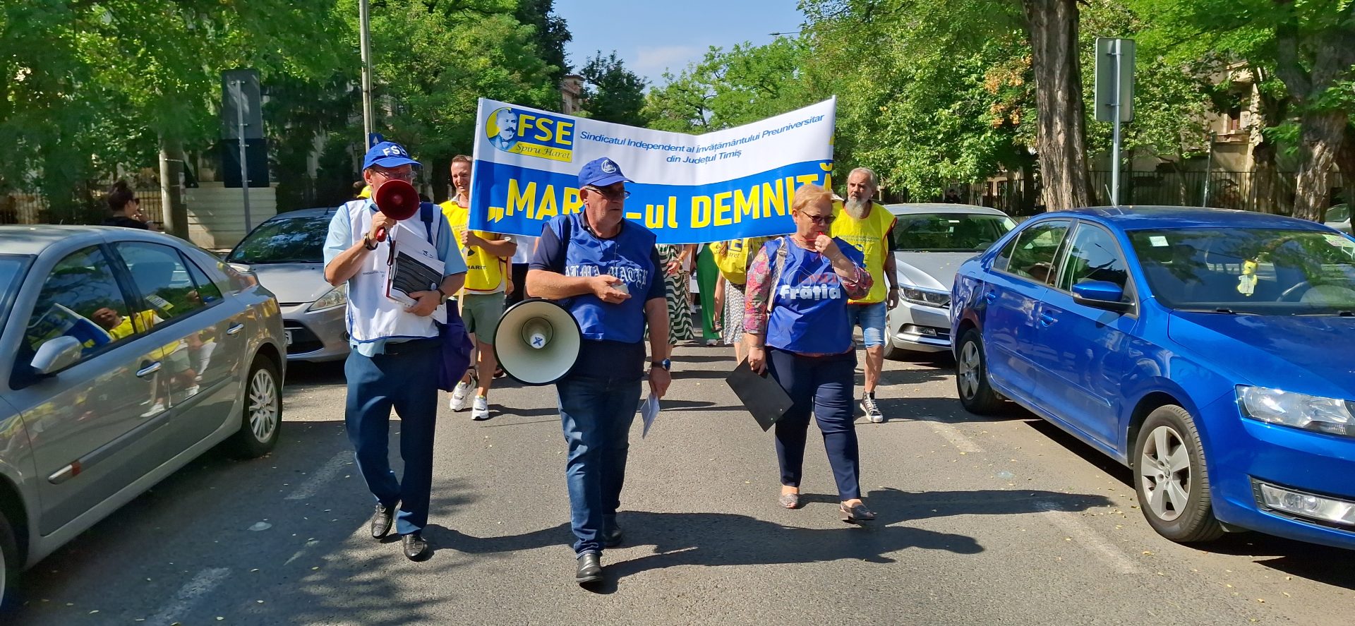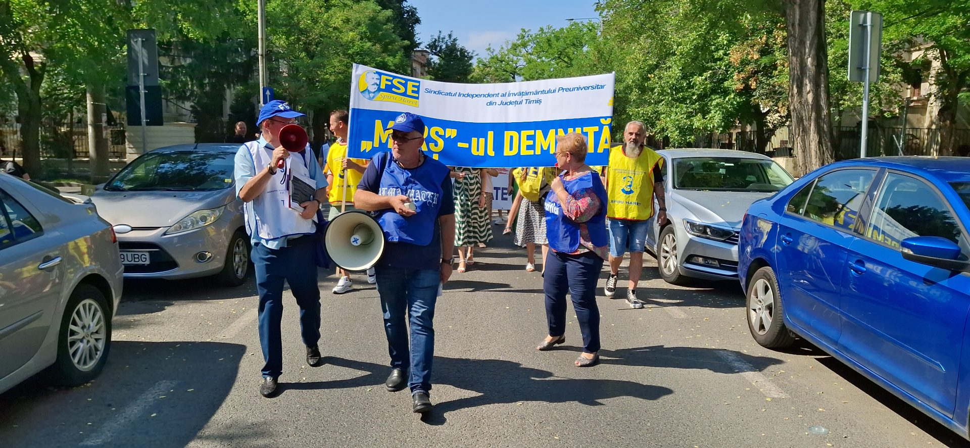 Vorbim pentru prima dată de șomaj masiv în sistemul de învățământ. La nivel național sunt peste 30.000 de posturi de cadre didactice și de cadre didactice auxiliare care au dispărut. Asta înseamnă foarte mult. Și având în vedere faptul că învățământul este prioritatea națională, așa cum bine știți, că tot declară toate partidele politice, dar de fapt suntem bătaia de joc a societății românesc. Pentru aceasta noi astăzi facem un marș al demnității, un marș a respectului, ca să se audă că și la Timișoara, ca de altfel în toate județele țării, în toate reședințele de județ, se fac asemenea acțiuni. Este un preludiu al marelui miting care va avea loc la București în data de 8, care privește de fapt și boicotarea începerii anului școlar, astfel încât poate guvernul se răzgândește și va abroga legea Bolojan.” a explicat contextul protestului Virgil Popescu, președinte executiv la sindicatul Spiru Haret.