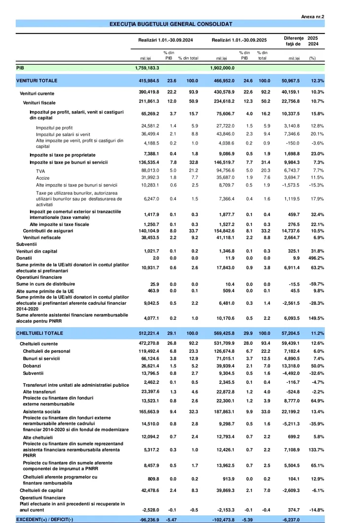 Deficitul bugetar al României este scăpat de sub control și orice măsură pe care Guvernul Bolojan a încercat-o nu a avut efect. Astfel, deficitul general consolidat al țării a urcat la 5,39% din PIB la finalul lunii septembrie a anului acesta, față de 4,54% în primele 8 luni ale anului, arată datele publicate de Ministerul Finanțelor. Astfel, deficitul bugetar a ajuns la 103 mld. lei, ușor sub nivelul din aceeași perioadă a anului 2024, când reprezenta 5,47% din PIB.