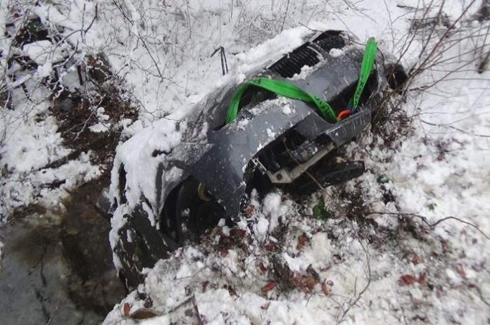 S-a întâmplat duminică. Șoferul unui BMW a pierdut controlul autoturismului, din cauza drumului plin de zăpadă, și a plonjat cu bolidul într-o râpă de aproximativ 15 metri.