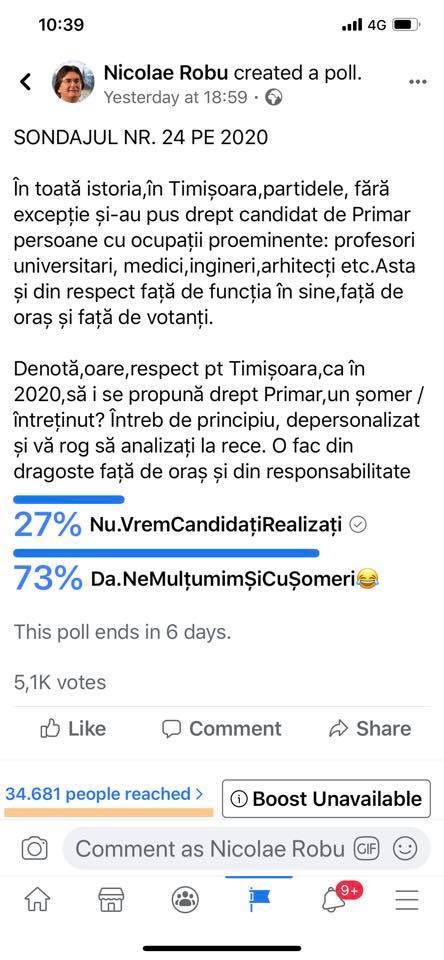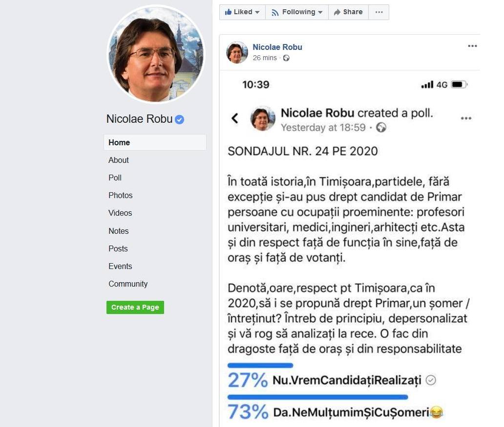 „În toată istoria, în Timișoara, partidele, fără excepție și-au pus drept candidat de Primar persoane cu ocupații proeminente: profesori universitari, medici,ingineri,arhitecți etc.Asta și din respect față de funcția în sine,față de oraș și față de votanți. Denotă,oare,respect pt Timișoara,ca în 2020,să i se propună drept Primar,un șomer / întreținut? Întreb de principiu, depersonalizat și vă rog să analizați la rece. O fac din dragoste față de oraș și din responsabilitate”, a scris, duminică, Robu, pe Facebook.
