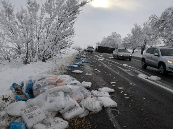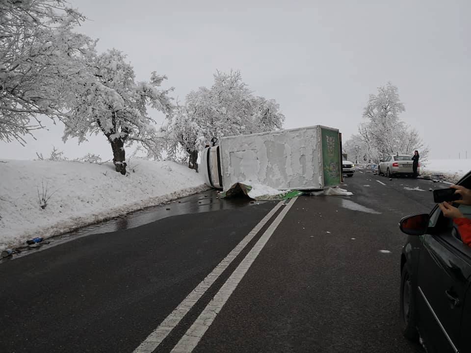 Accidentul a avut loc în apropiere de Orțișoara. Mașina de marfă a ajuns de-a curmezișul pe șosea după ce un cauciuc ar fi explodat. Șoferul a scăpat fără răni, dar marfa ce o transporta a ajuns împrăștiată pe șosea.