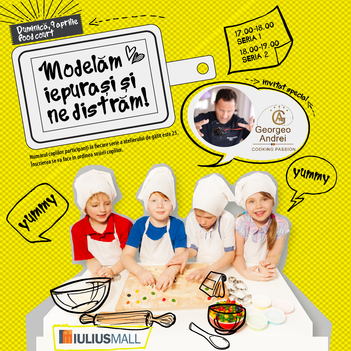 Modelăm iepuraşi şi ne distrăm! Aceasta este invitaţia adresată prichindeilor, de Iulius Mall, pentru după-amiaza de duminică. În aşteptarea sărbătorilor pascale, copiii vor învăţa de la Chef Georgeo Andrei să modeleze iepuraşi simpatici şi dulci, din pastă de zahăr. Atelierele de creaţie sunt programate în două serii, de la ora 17.00, respectiv 18.00, şi vor avea loc în food court. Numărul copiilor participanţi la fiecare serie este de 25, iar înscrierile se fac în ordinea sosirii celor mici.