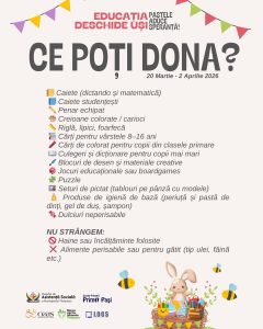 În perioada 20 martie – 2 aprilie 2026, timișorenii sunt invitați să contribuie la această cauză prin donarea de rechizite școlare (caiete, penare echipate, creioane colorate și carioci, blocuri de desen etc.) cărți potrivite pentru copiii între 8-16 ani, culegeri sau dicționare, materiale și jocuri educaționale, noi sau în stare bună. Se mai pot dona produse de igienă de bază (periuță și pasta de dinți, gel de duș, șampon) și dulciuri neperisabile.